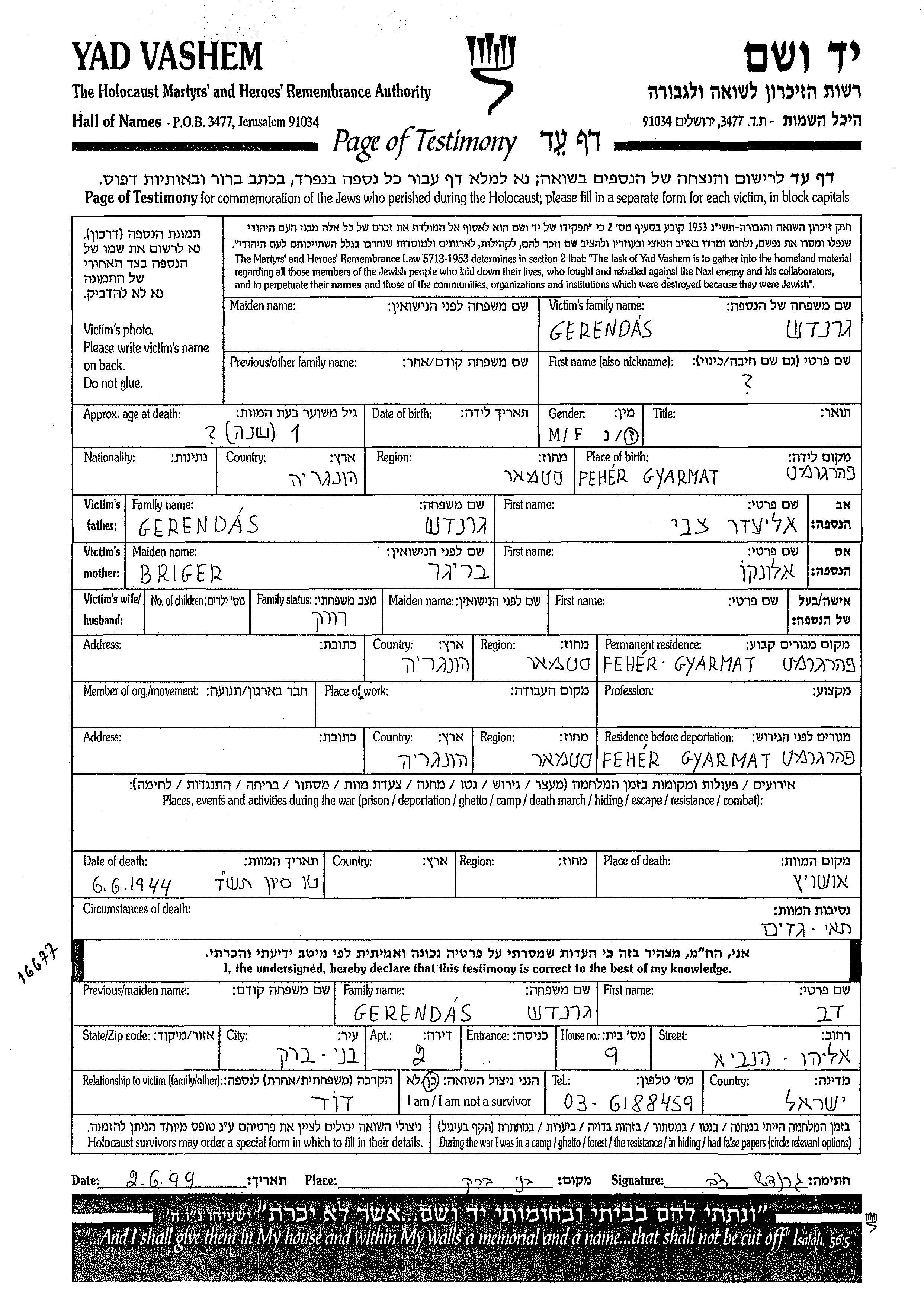 Gerendas prénom inconnu Feher-Gyarmat, Hongrie Feuille de témoignage