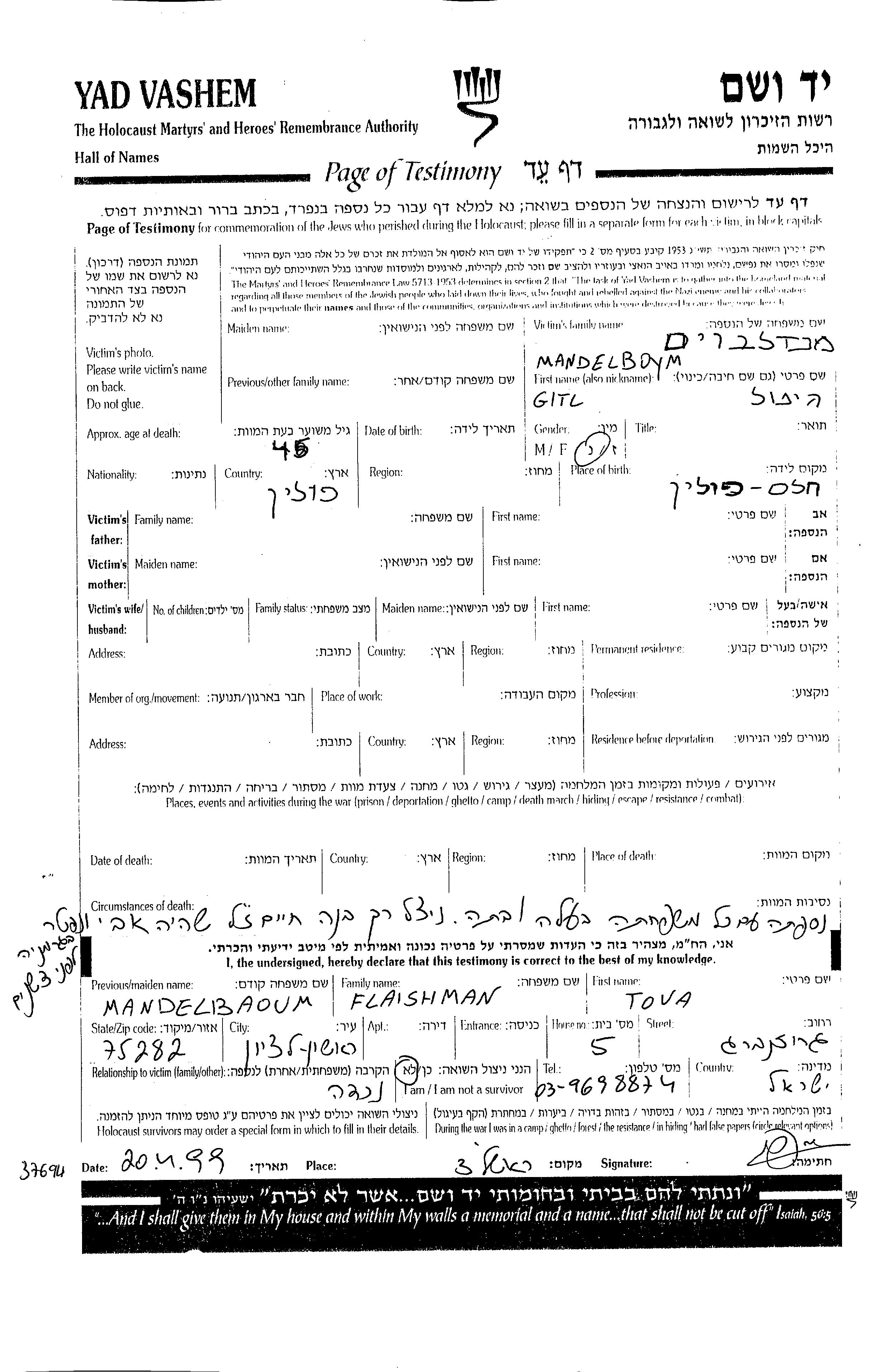 Mandelboym Gitl endroit inconnu, Feuille de témoignage