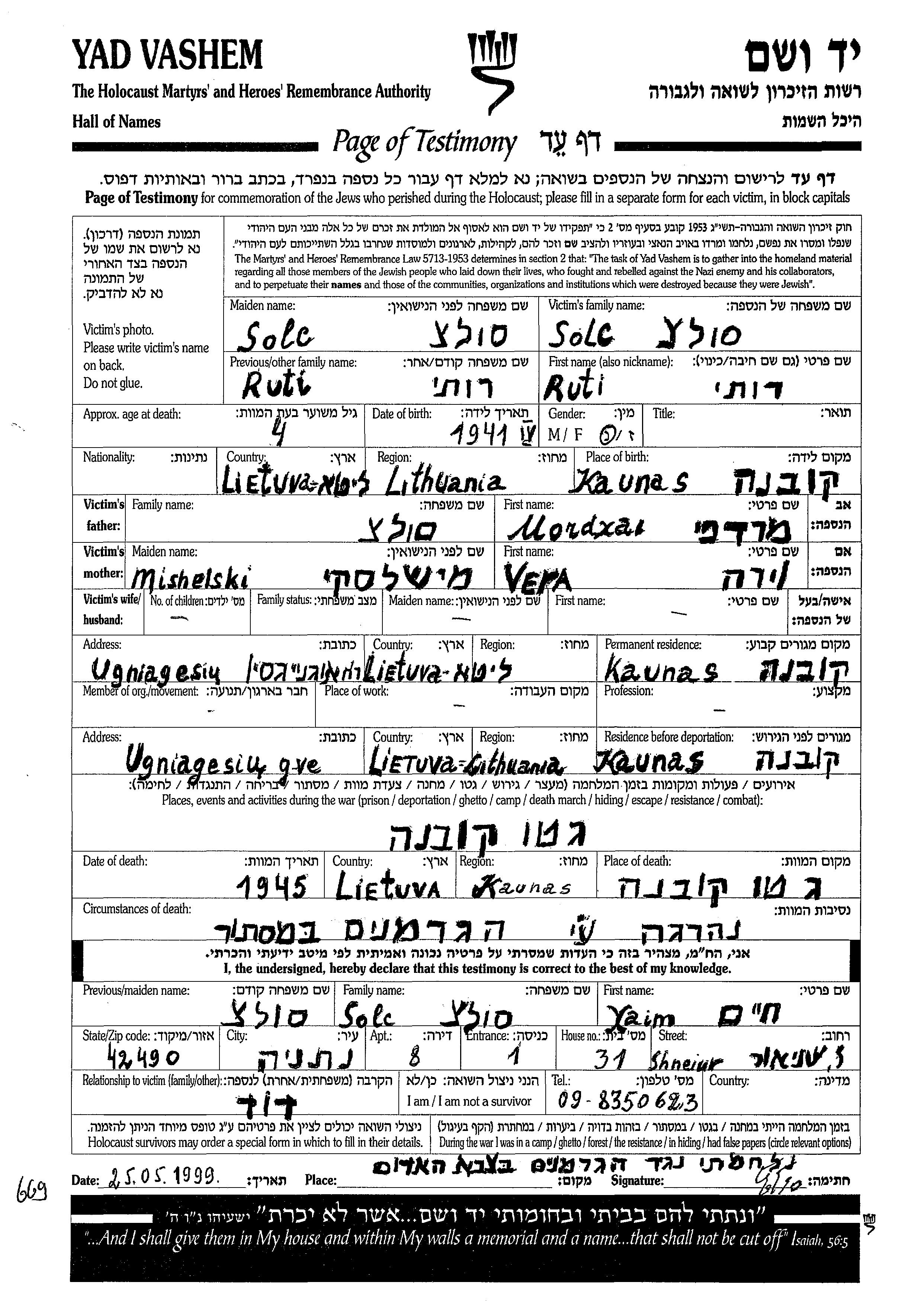 Solc Ruti 1941 Kaunas, Lituanie Feuille de témoignage