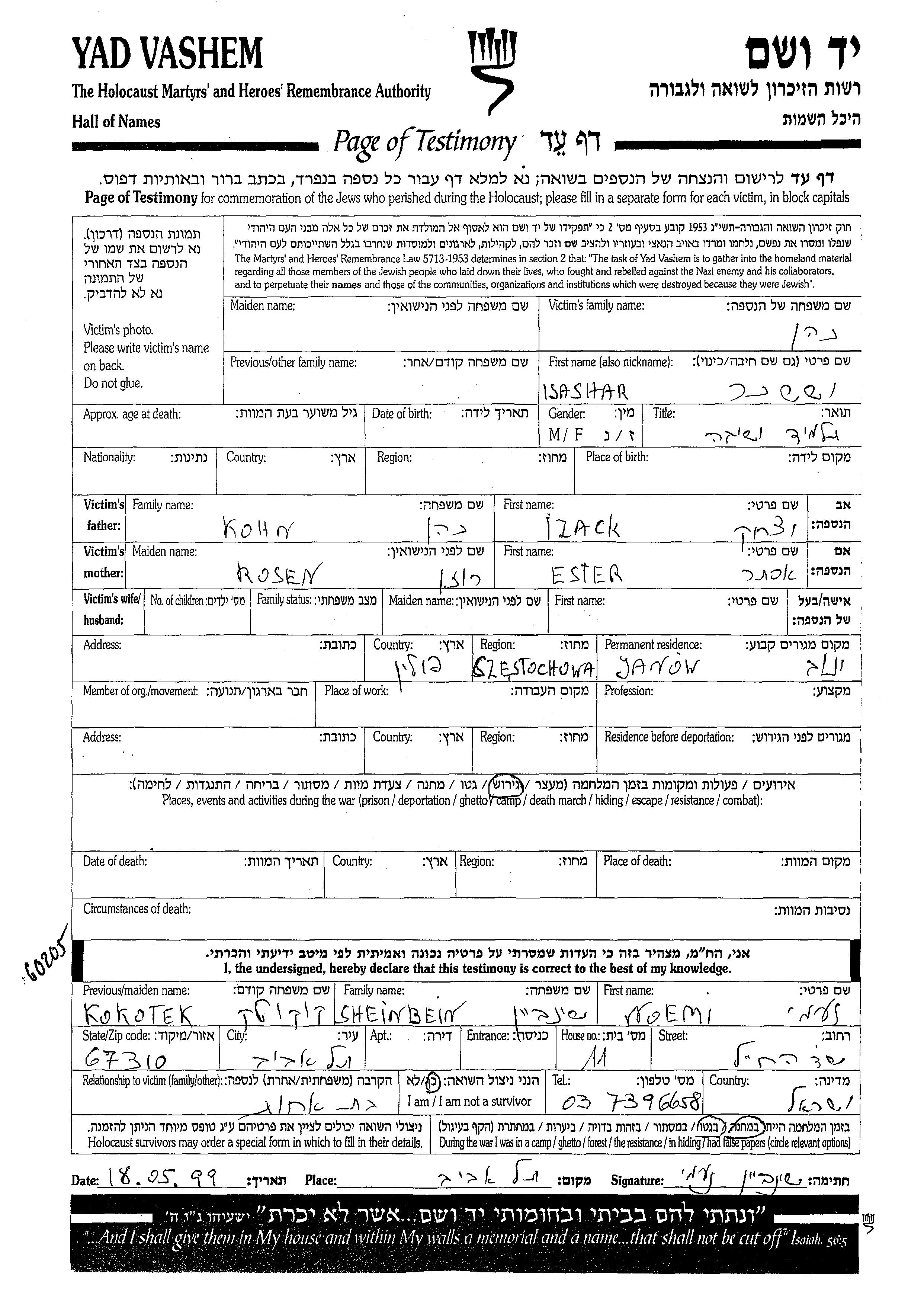 Kohen Isashar Yanow, Pologne Feuille de témoignage