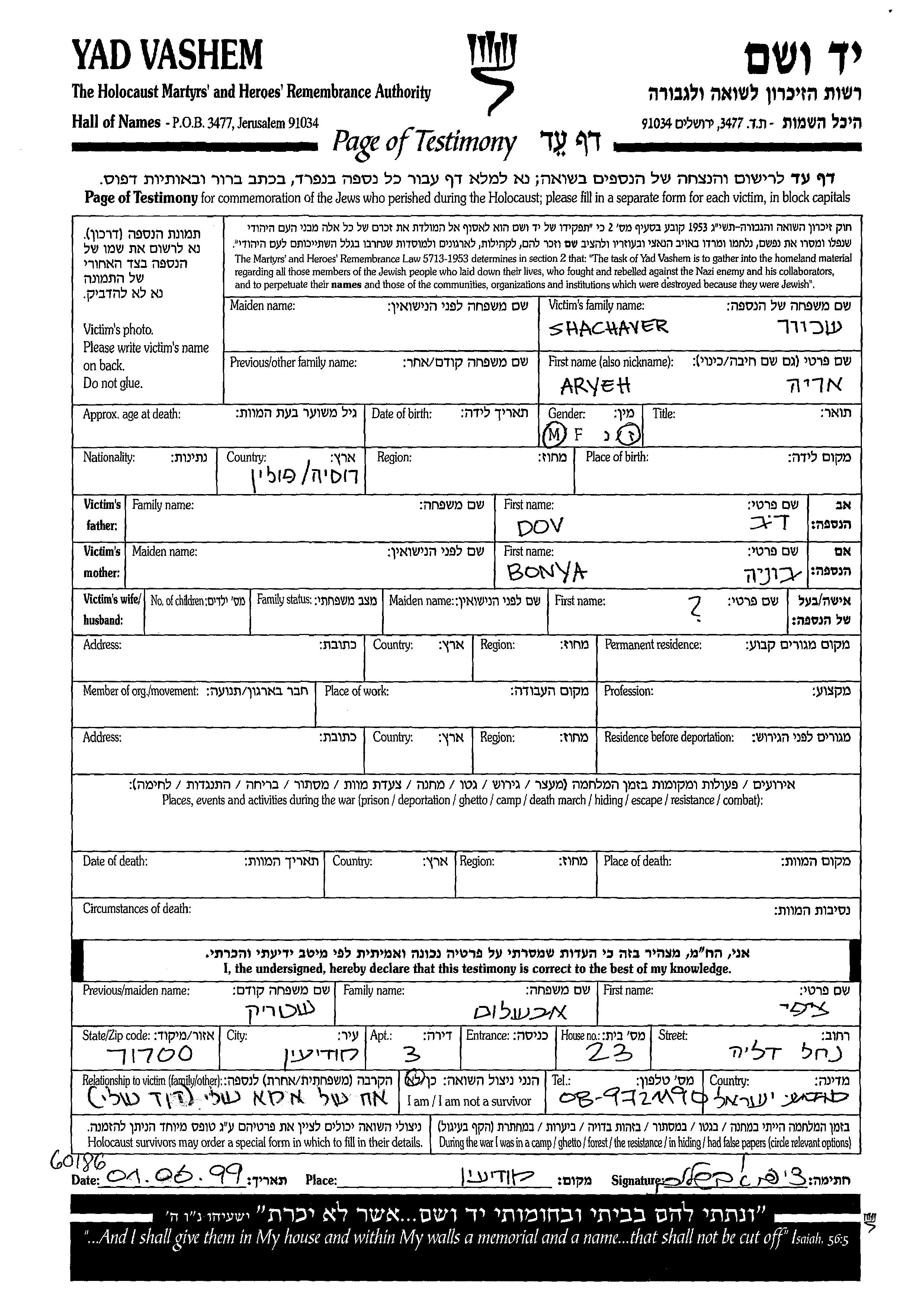 Shachaver Aryeh endroit inconnu, Feuille de témoignage