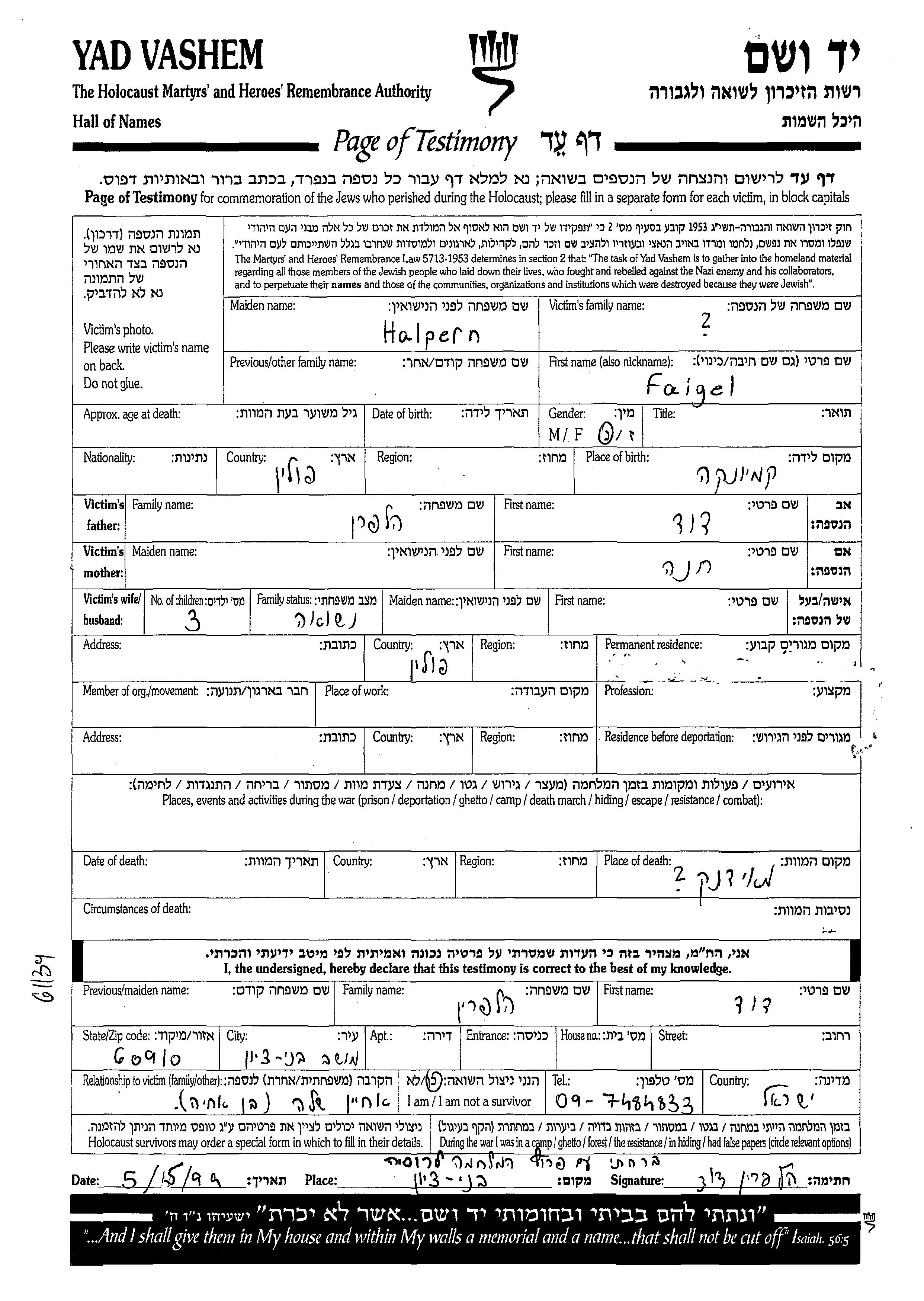 Yad Vashem - Pages of Testimony Names Memorial Collection