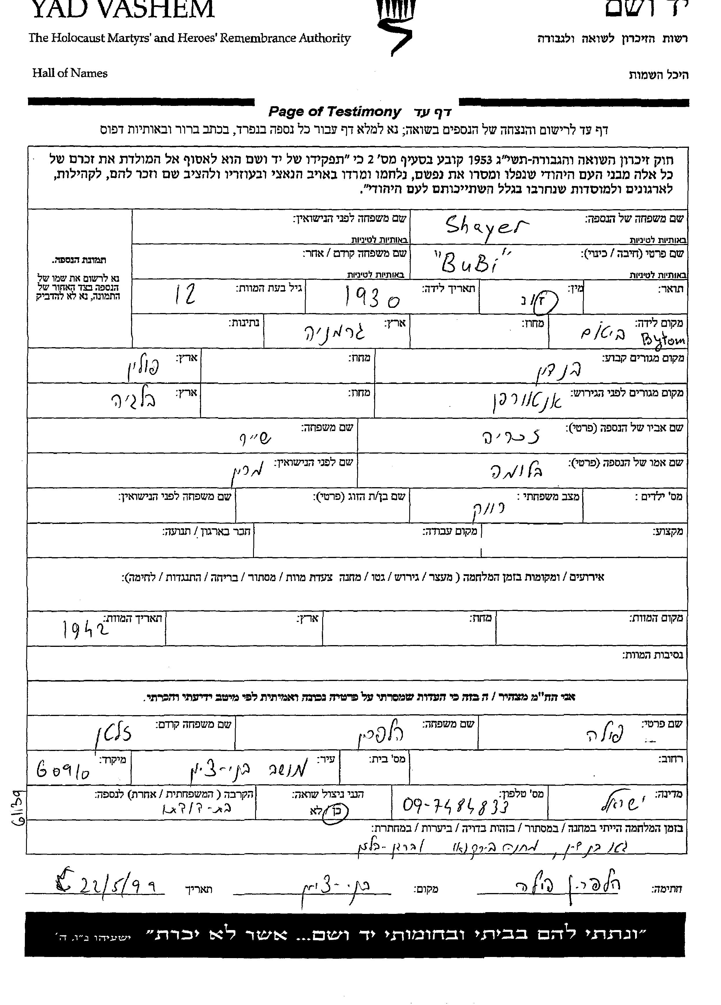Shayer Bubi 1930 Bendin, Pologne Feuille de témoignage
