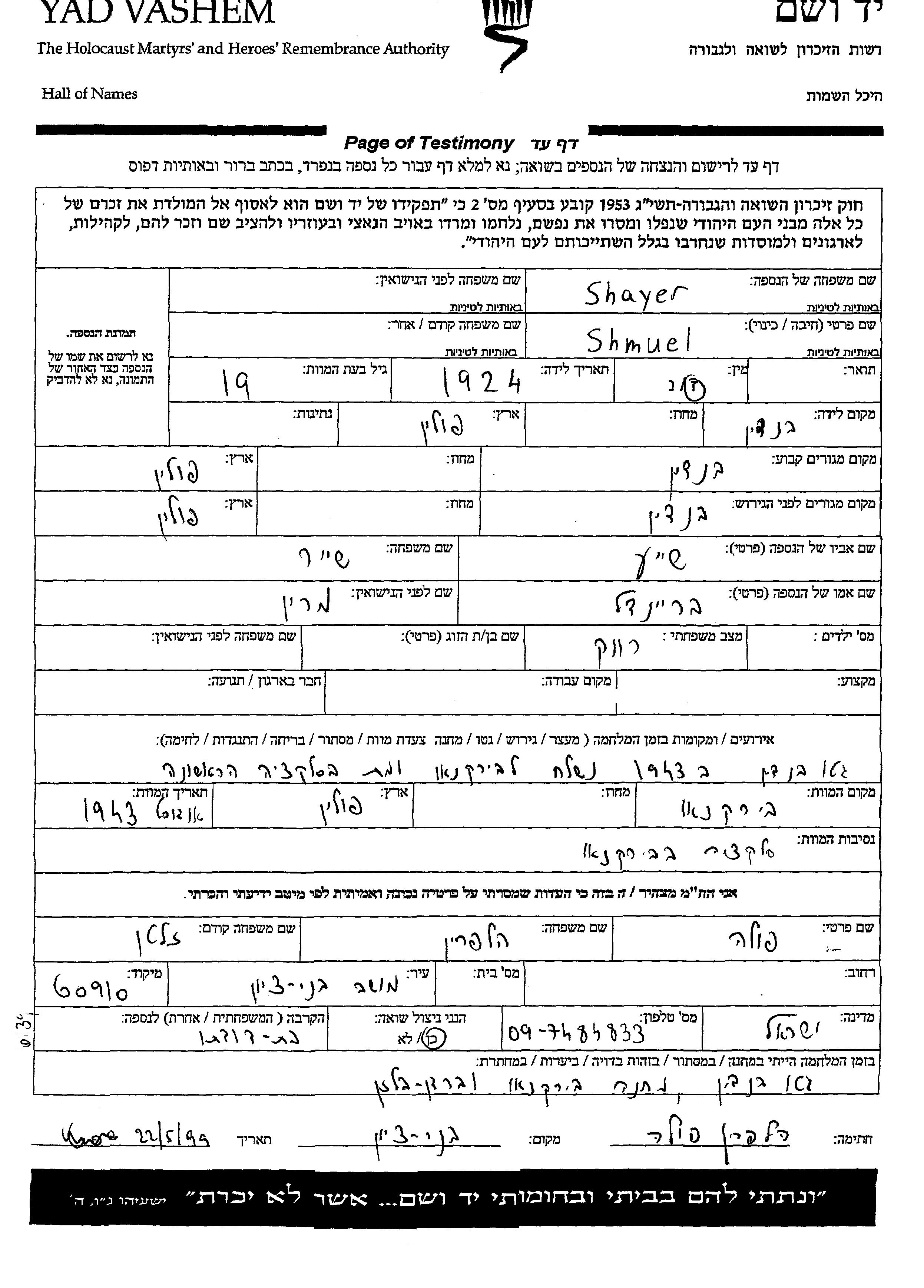 Shayer Shmuel 1924 Bendin, Pologne Feuille de témoignage