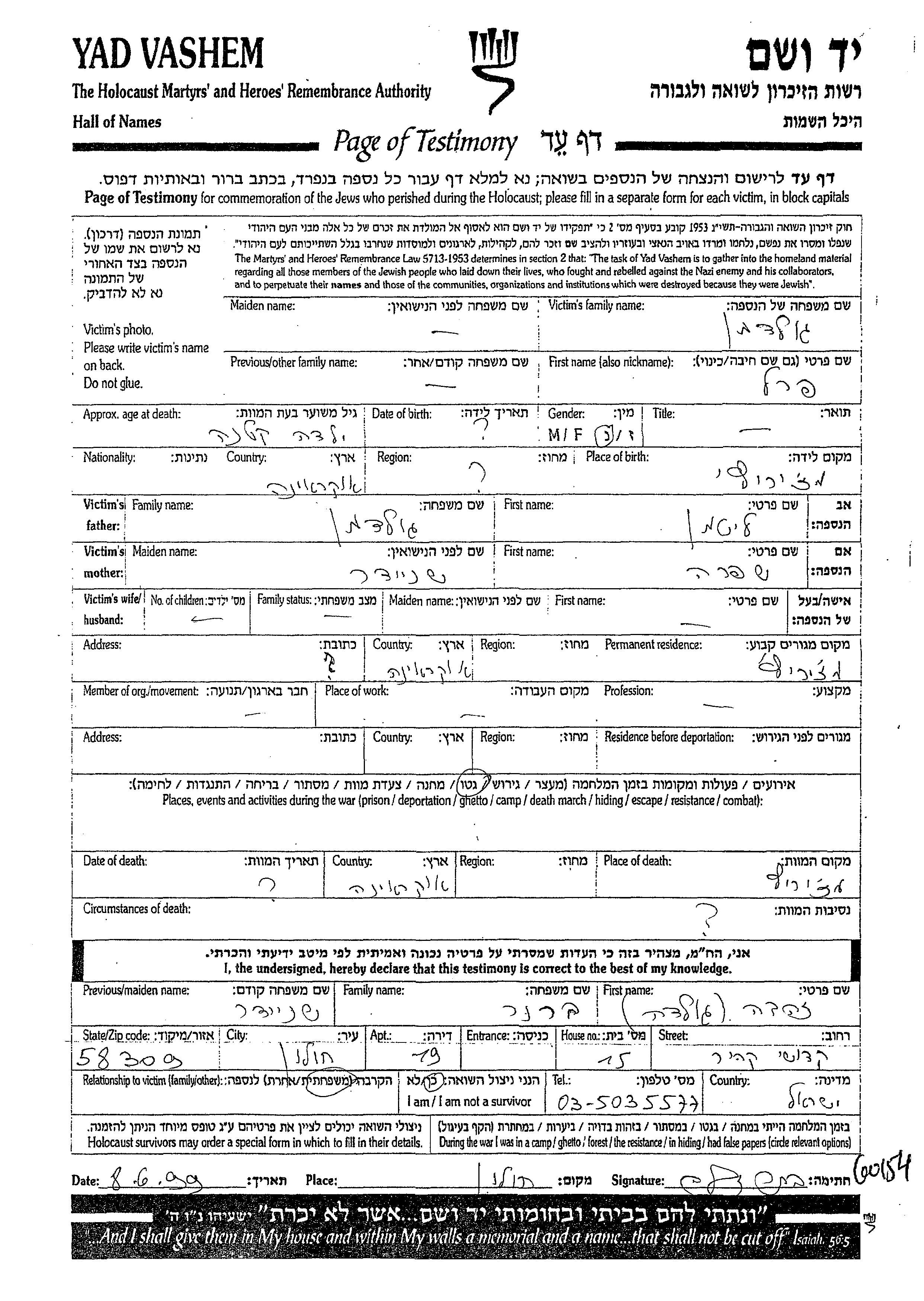 Yad Vashem - Pages of Testimony Names Memorial Collection