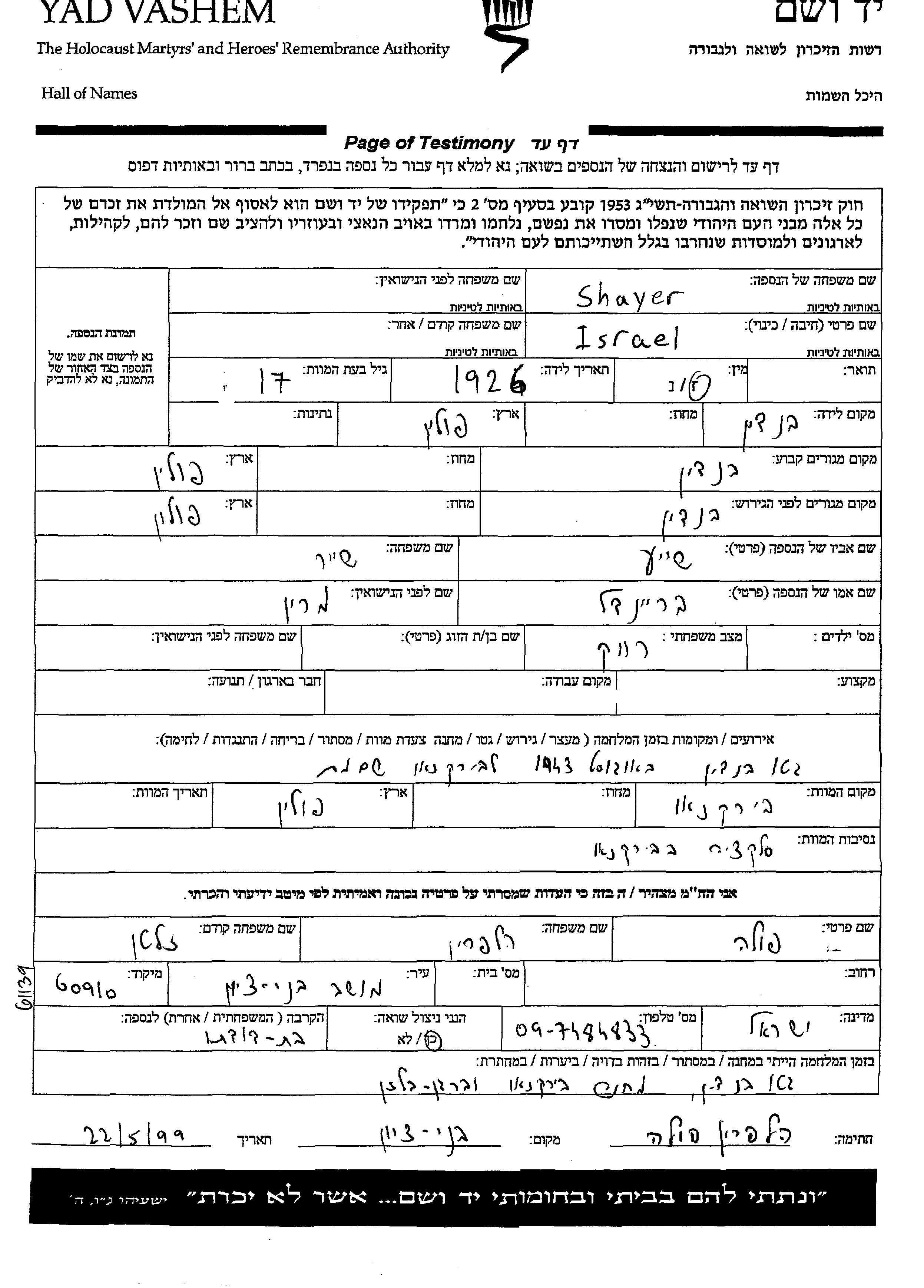 Israel Shayer est né à Bendin, Pologne en 1926, fils de Shiye et de Braindel. Il était Célibataire. Avant la seconde guerre mondiale il vivait à Bendin, Pologne. Au cours de la guerre, il était à Bendin, Pologne.