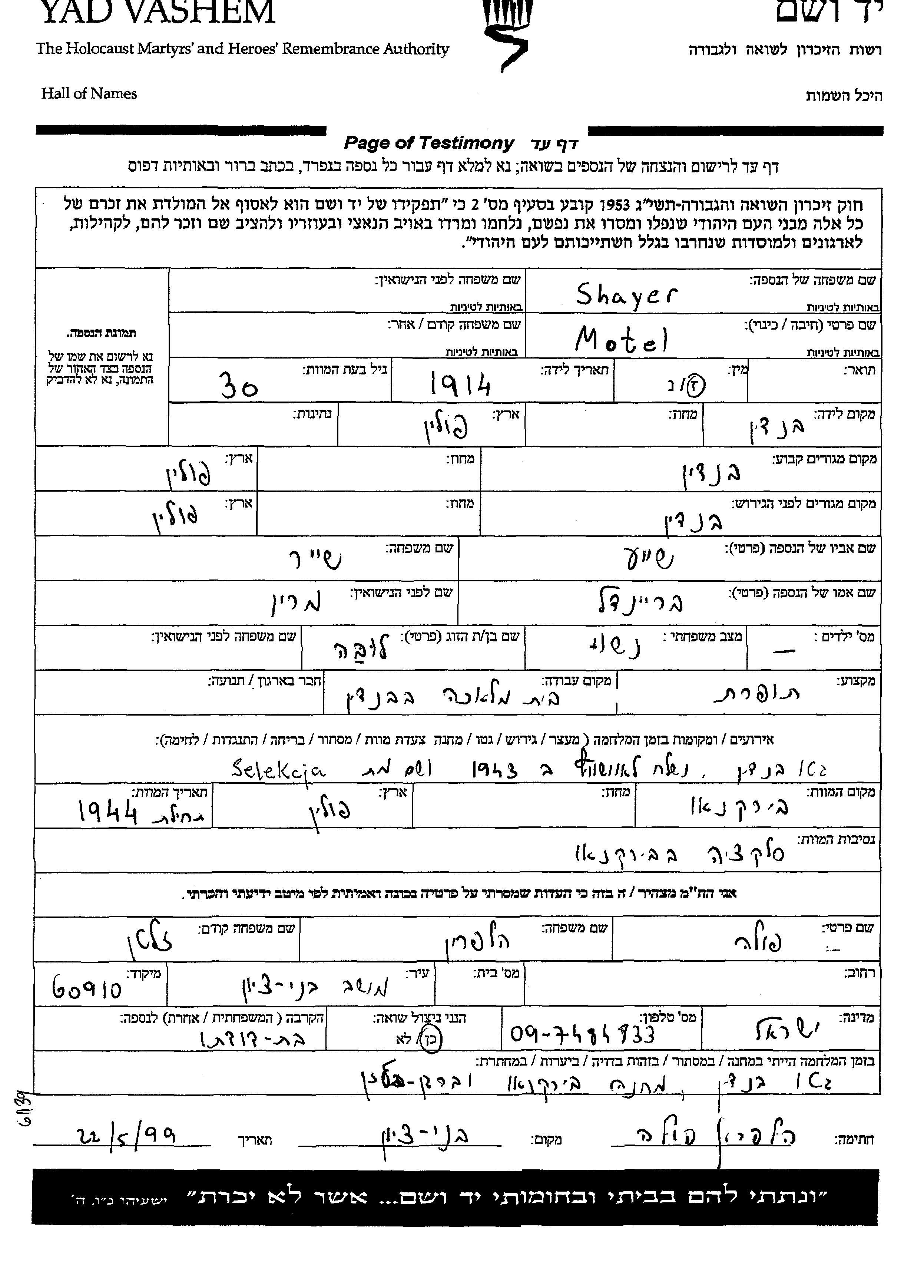 Motel Shayer est né à Bendin, Pologne en 1914, fils de Shiye et de Braindel. Il était Mariée à Luba. Avant la seconde guerre mondiale il vivait à Bendin, Pologne. Au cours de la guerre, il était à Bendin, Pologne.