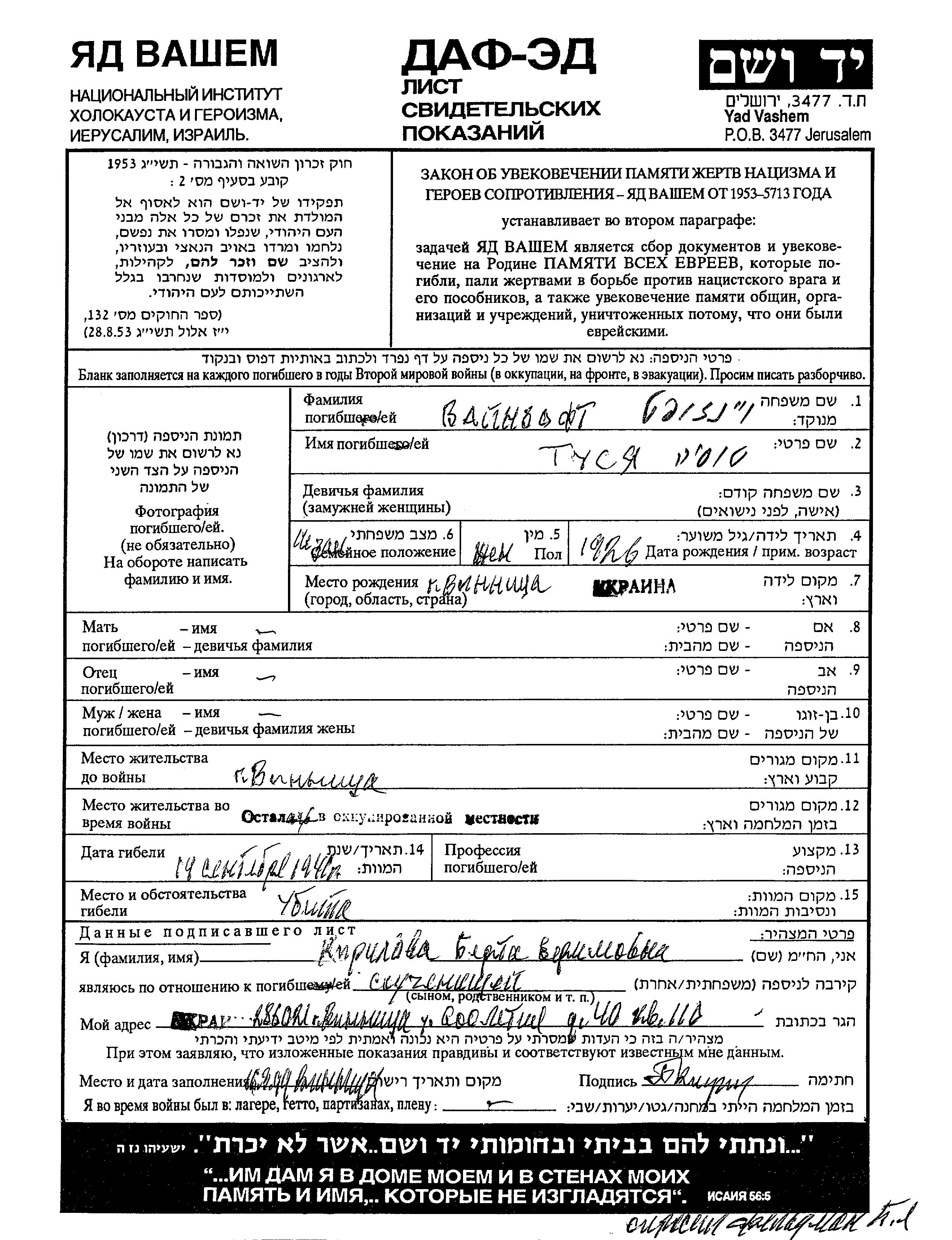 | Vainzoft | Tusya | 1926 | Vinnitsa, Ukraine (URSS) | Feuille de témoignage |