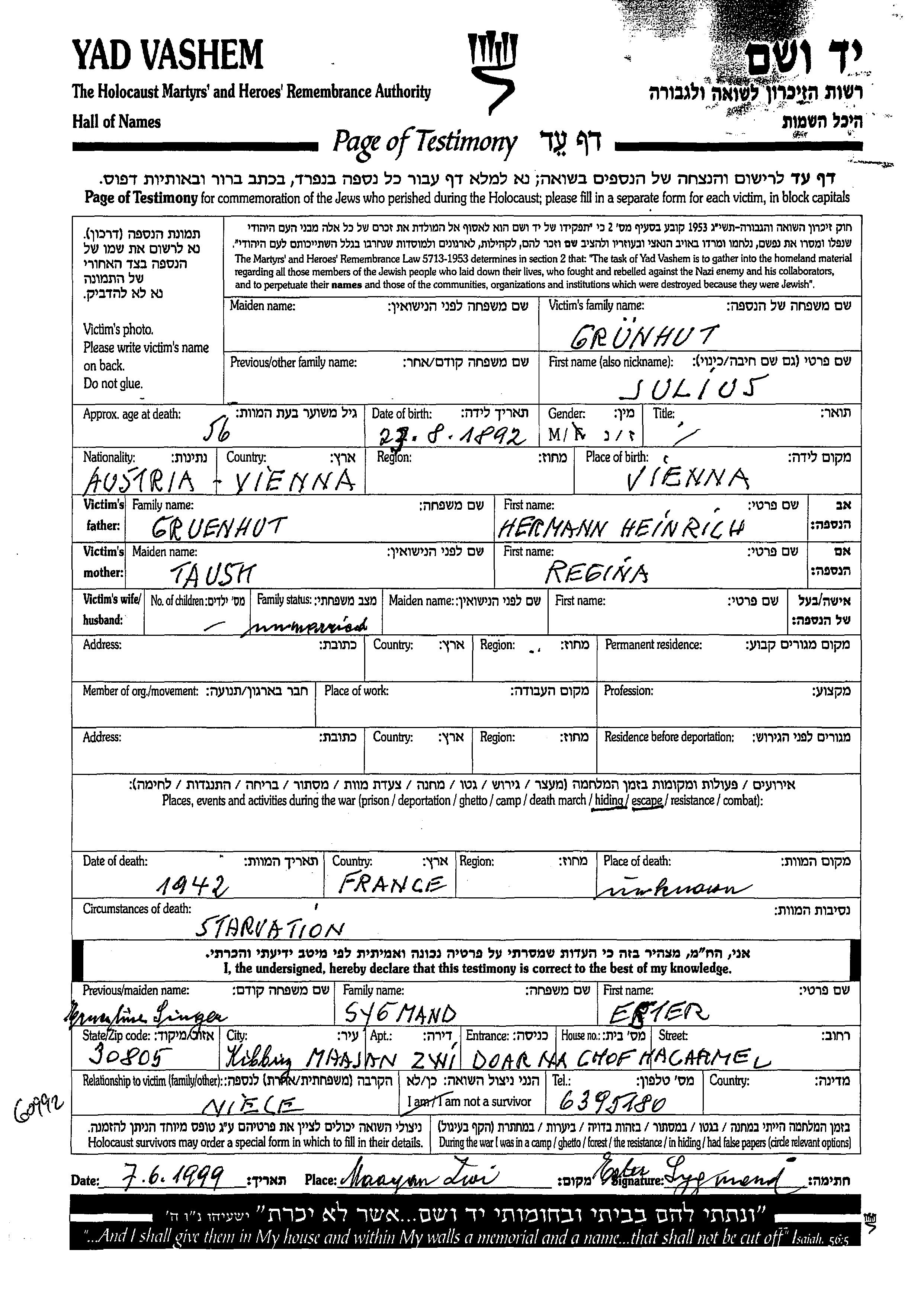 Grunhut Julius 1892 endroit inconnu, Feuille de témoignage