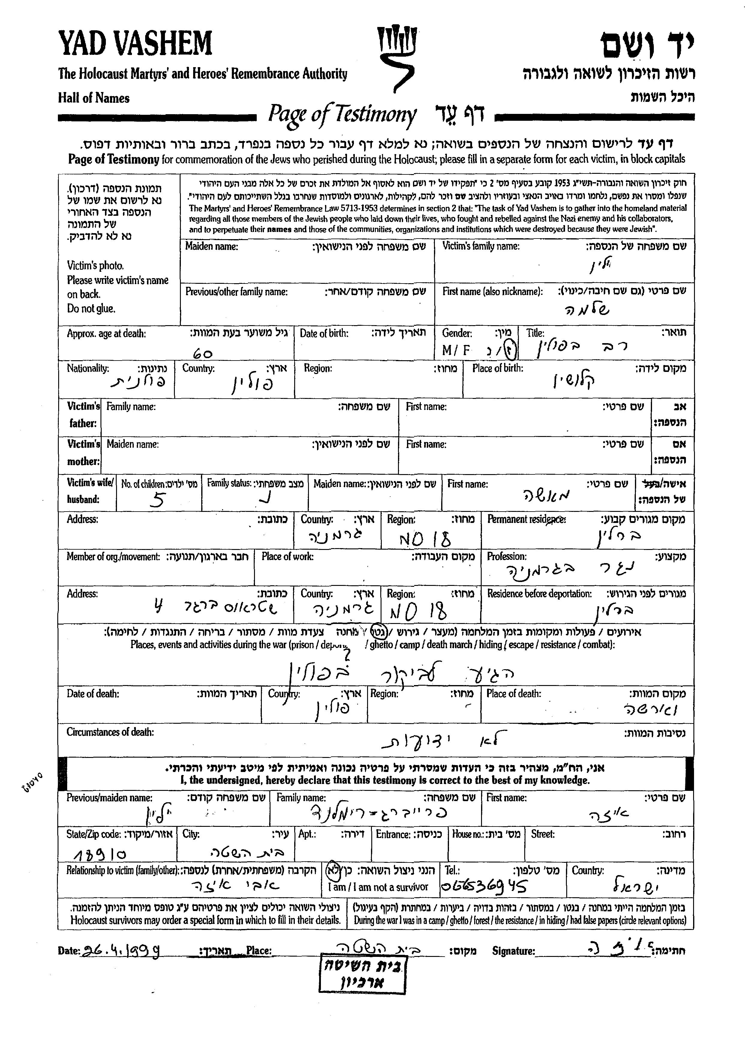 Yad Vashem - Pages of Testimony Names Memorial Collection