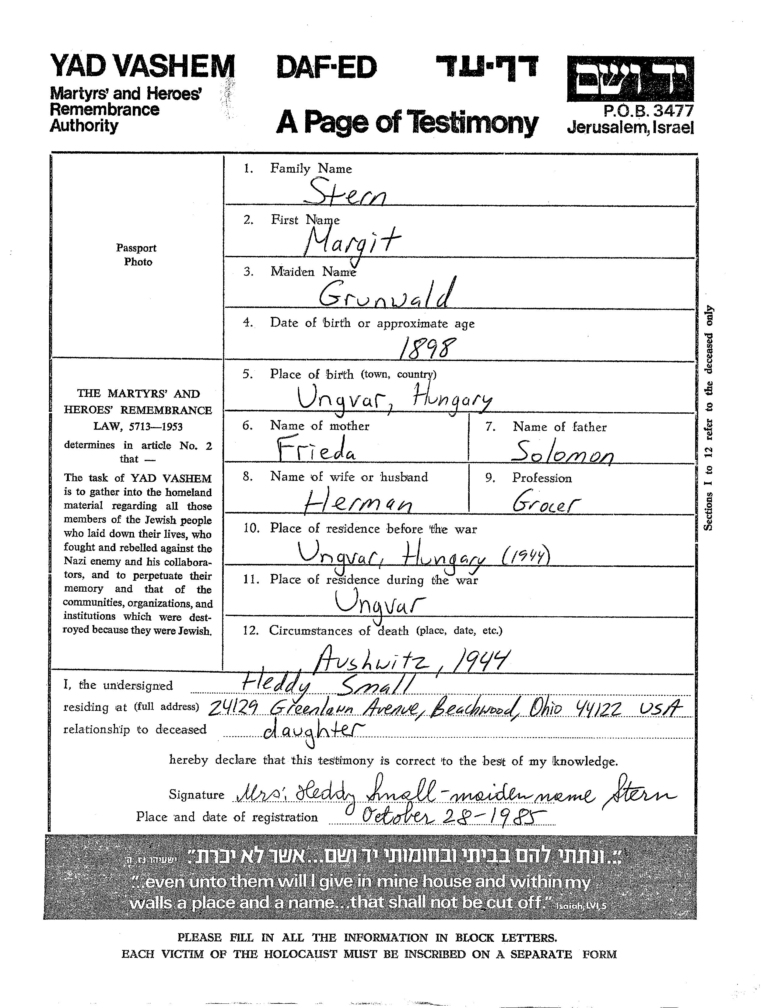Margit Stern née Grunwald est née à Ungvar, Tchécoslovaquie en 1898, fille de Solomon et de Frieda. Elle était Épicier/e et Mariée à Herman. Avant la seconde guerre mondiale elle vivait à Ungvar, Tchécoslovaquie. Pendant la guerre, elle était à Ungvar, Tchécoslovaquie.