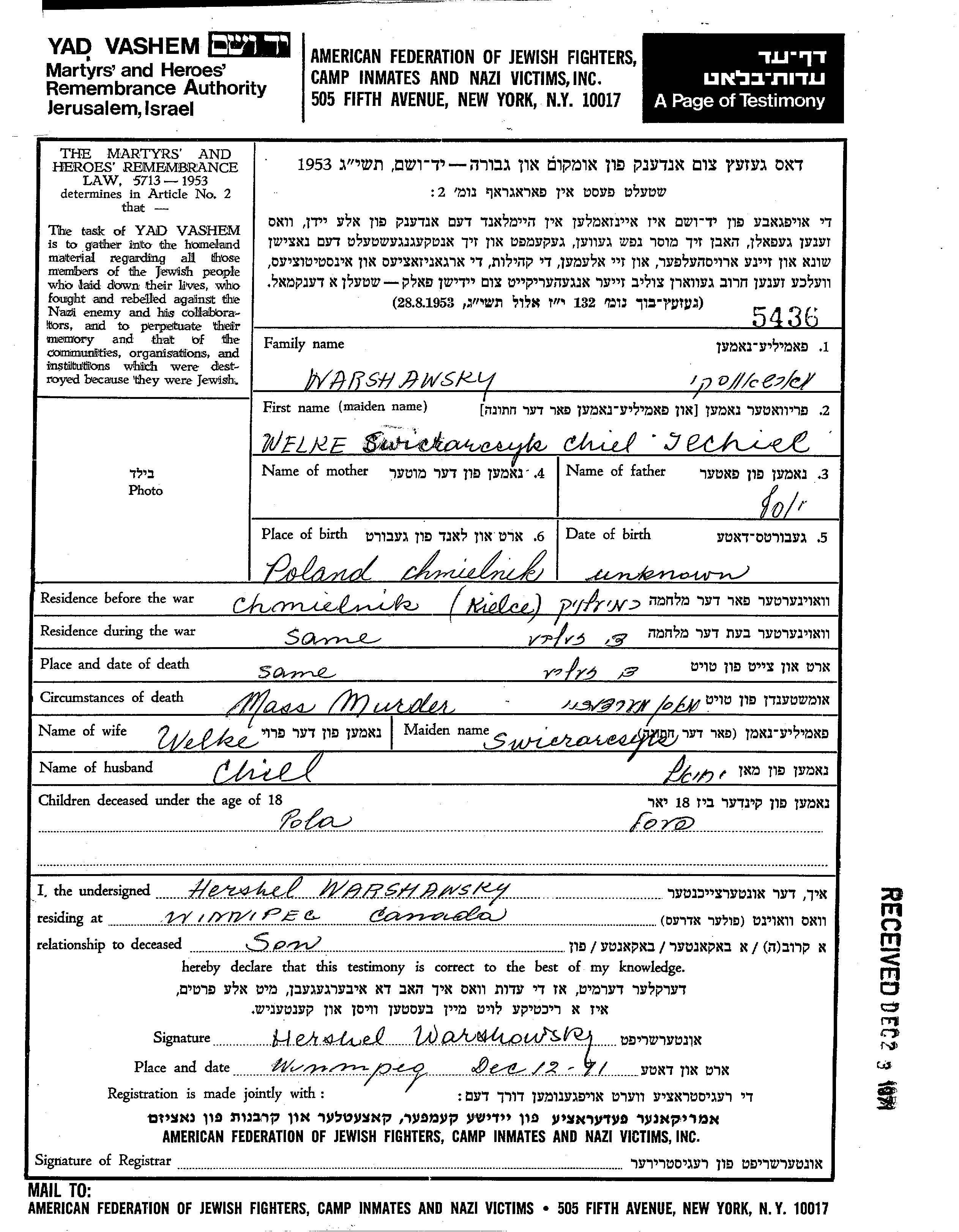 Warshawsky Chiel Chmielnik, Pologne Feuille de témoignage