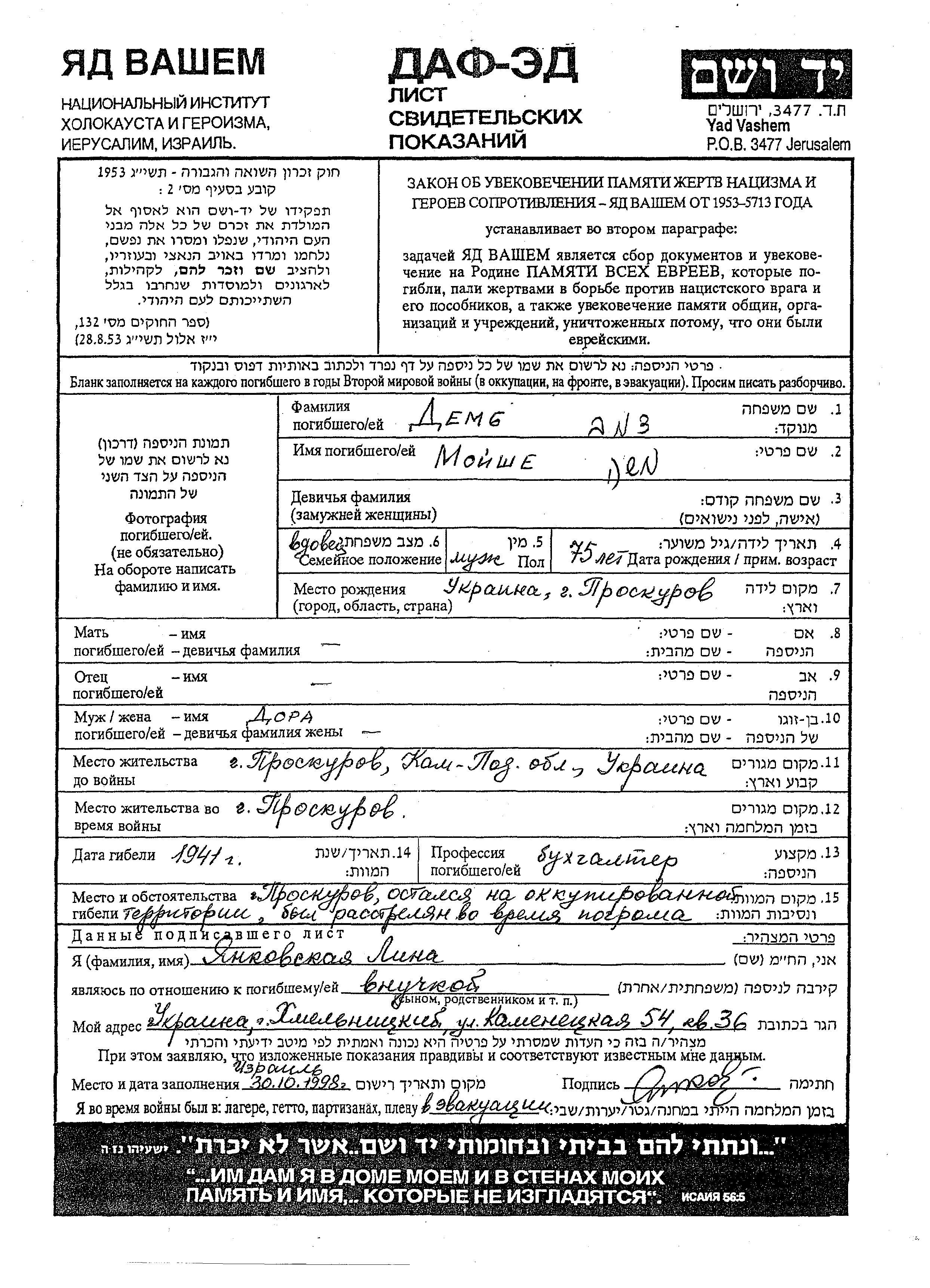Demb Moishe Proskurov, Ukraine (URSS) Feuille de témoignage