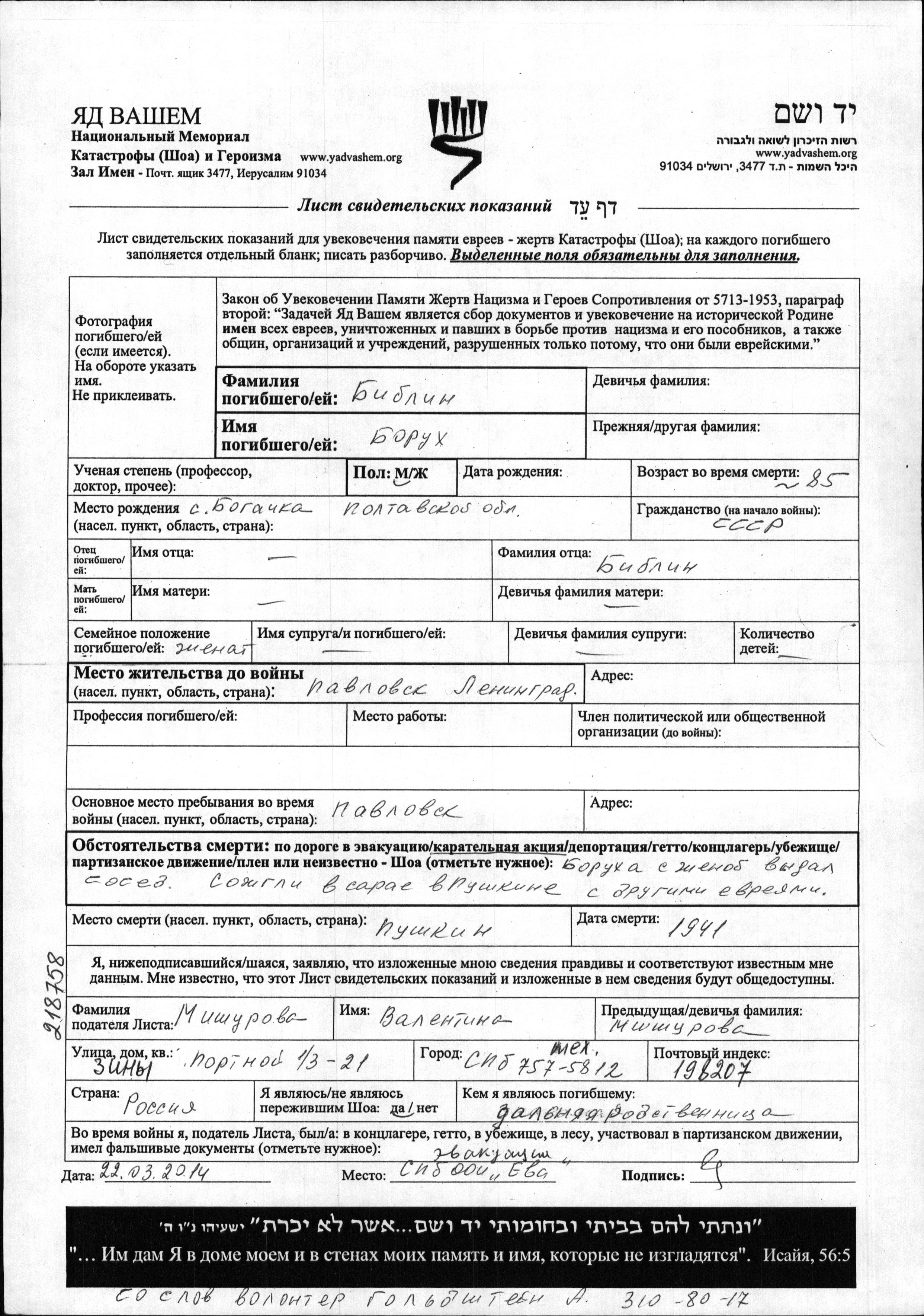 Biblin Borukh Pavlovsk, Russie (URSS) Feuille de témoignage