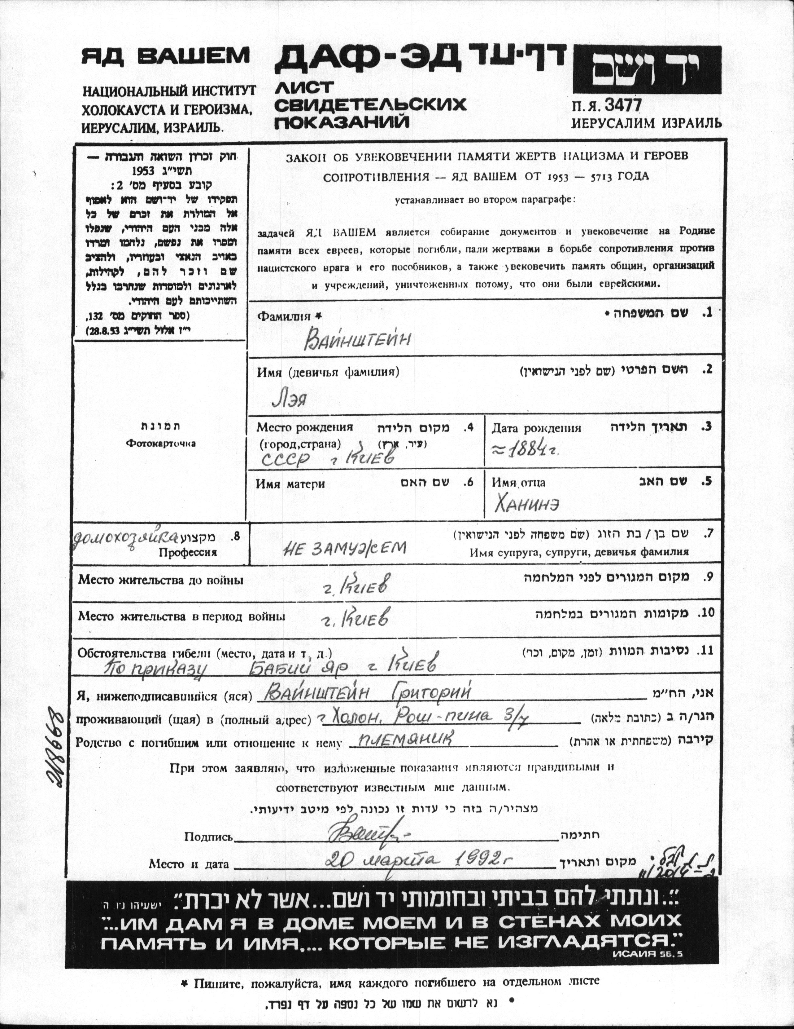 Leya Vaynshteyn est née à Kiev, Ukraine (URSS) en 1884, fille de Khanine. Elle était Femme au foyer et Célibataire. Avant la seconde guerre mondiale elle vivait à Kiev, Ukraine (URSS). Pendant la guerre, elle était à Kiev, Ukraine (URSS).