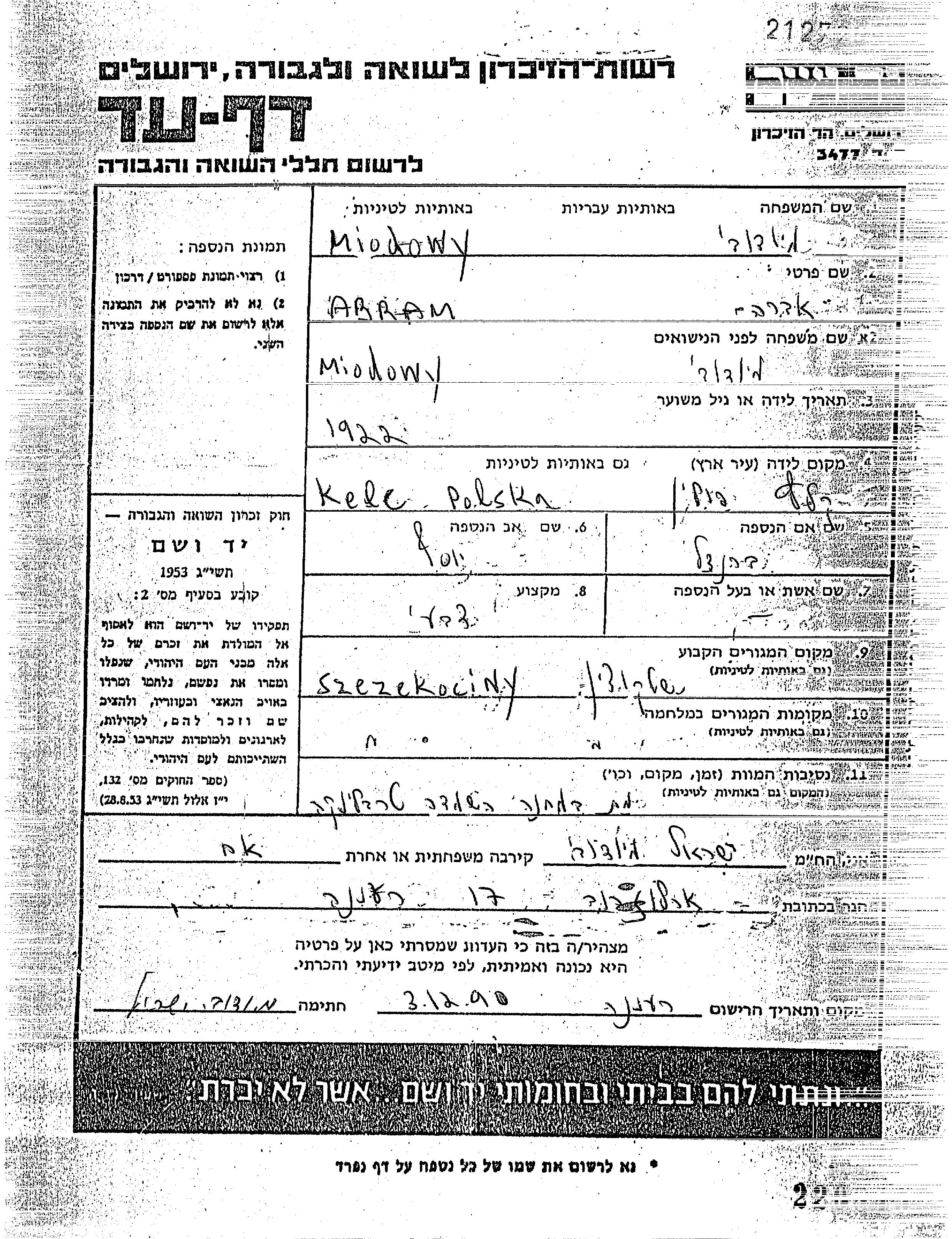 Abram Miodowy est né à Kelc, Pologne en 1922, fils de Yosef et de Brandel. Il était Peintre en bâtiment. Avant la seconde guerre mondiale il vivait à Szczekociny, Pologne. Au cours de la guerre, il était à Szczekociny, Pologne.