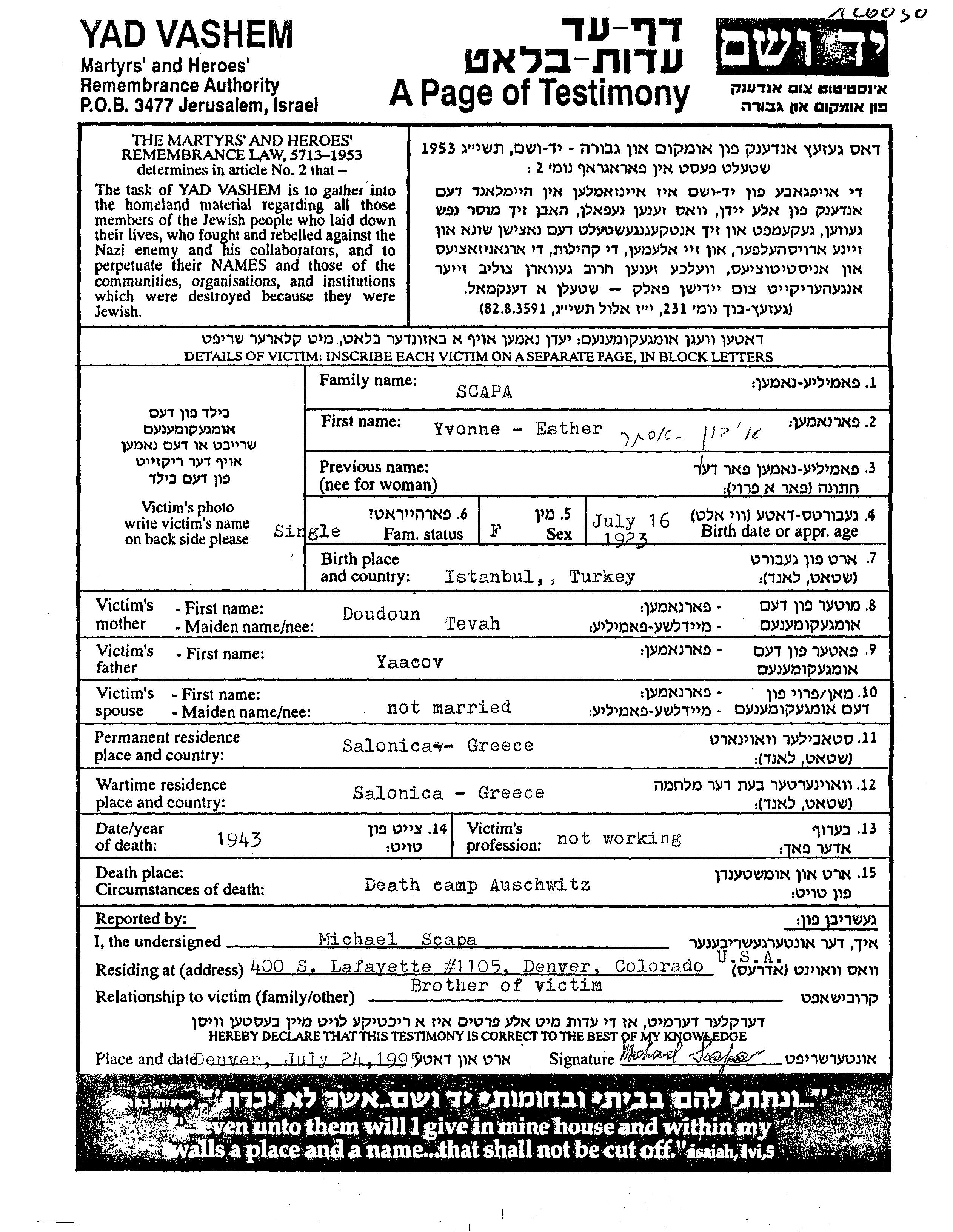 Yvonne Esther Scapa est née à Istanbul, Turquie en 1923, fille de Yaacov et de Doudoun Tevah. Elle était Célibataire. Avant la seconde guerre mondiale elle vivait à Salonico, Grèce. Pendant la guerre, elle était à Salonico, Grèce.