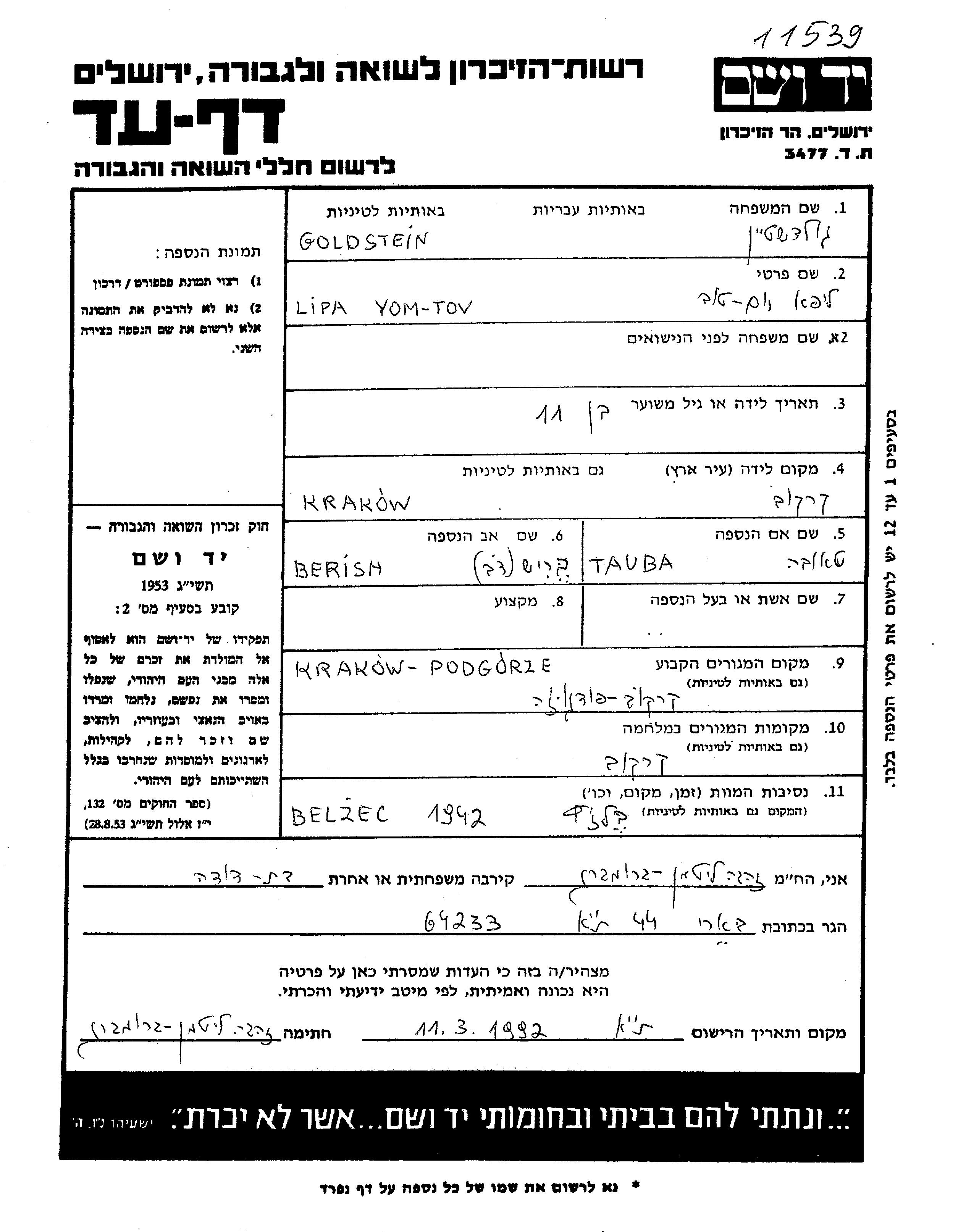 Lipa Yom Tov Goldstein est né à Krakow, Pologne en 1931, fils de Dov Berish et de Tauba. Il était Enfant. Avant la seconde guerre mondiale il vivait à Krakow, Pologne. Au cours de la guerre, il était à Podgorze, Pologne.