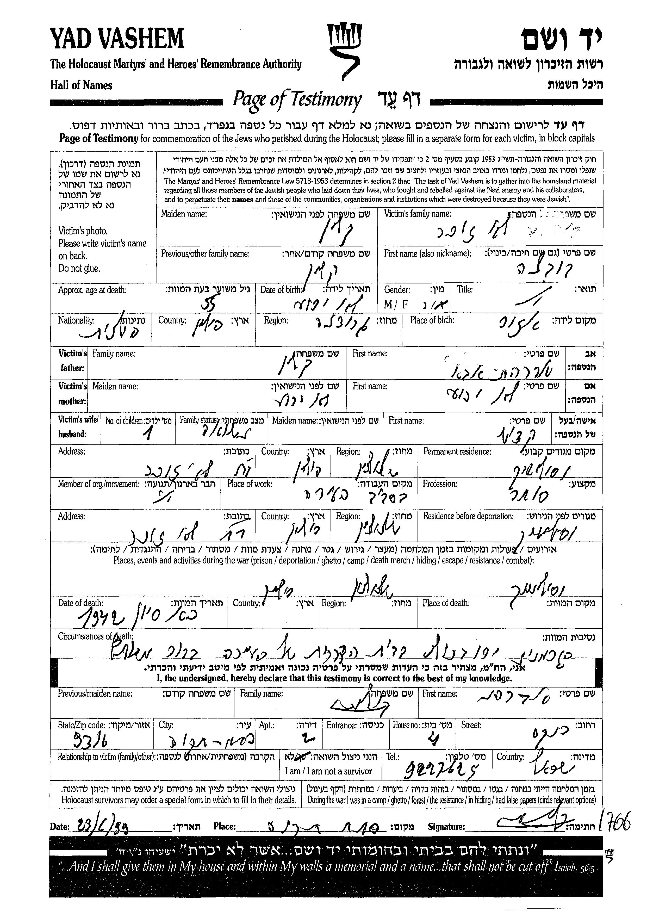Yad Vashem - Pages of Testimony Names Memorial Collection