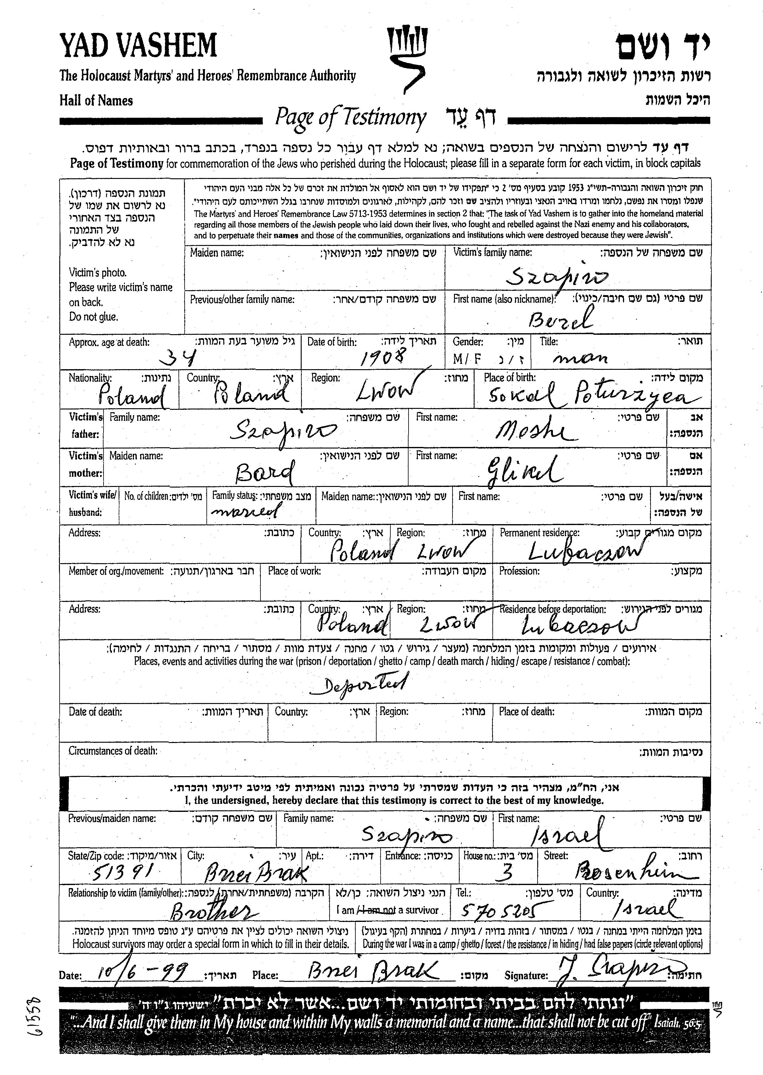 Szapiro Berl 1908 Lubaczow, Pologne Feuille de témoignage