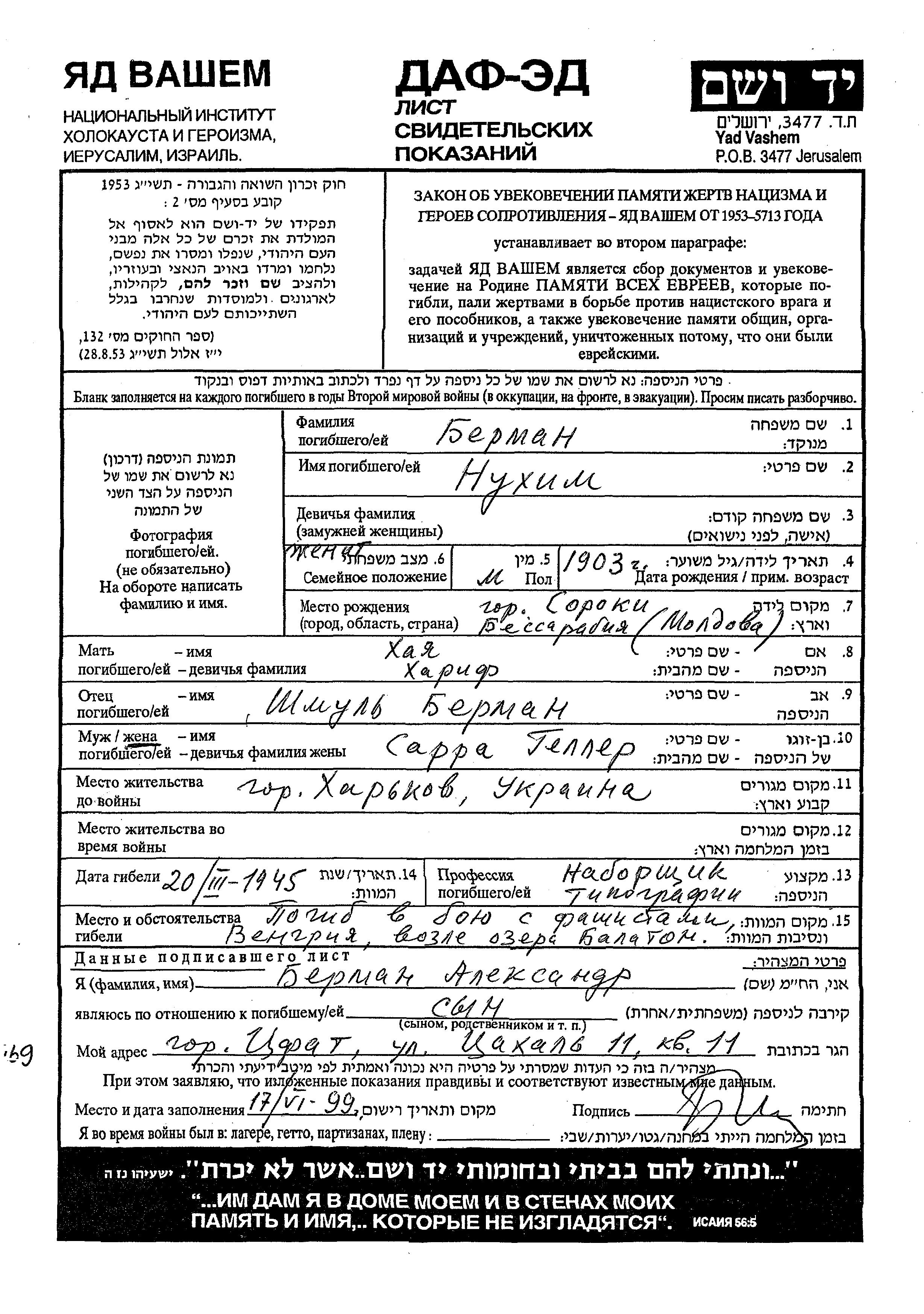Nukhim Berman est né à Soroki, Roumanie en 1903, fils de Shmul et de Khaia. Il était Typographe et Mariée à Sarra. Avant la seconde guerre mondiale il vivait à Kharkov, Ukraine (URSS). Au cours de la guerre, il était à the Soviet armed forces. Nukhim a été tué en tant que militaire pendant la Seconde Guerre mondiale. Lieu de la mort: Balaton Fured, Hongrie en 1945.