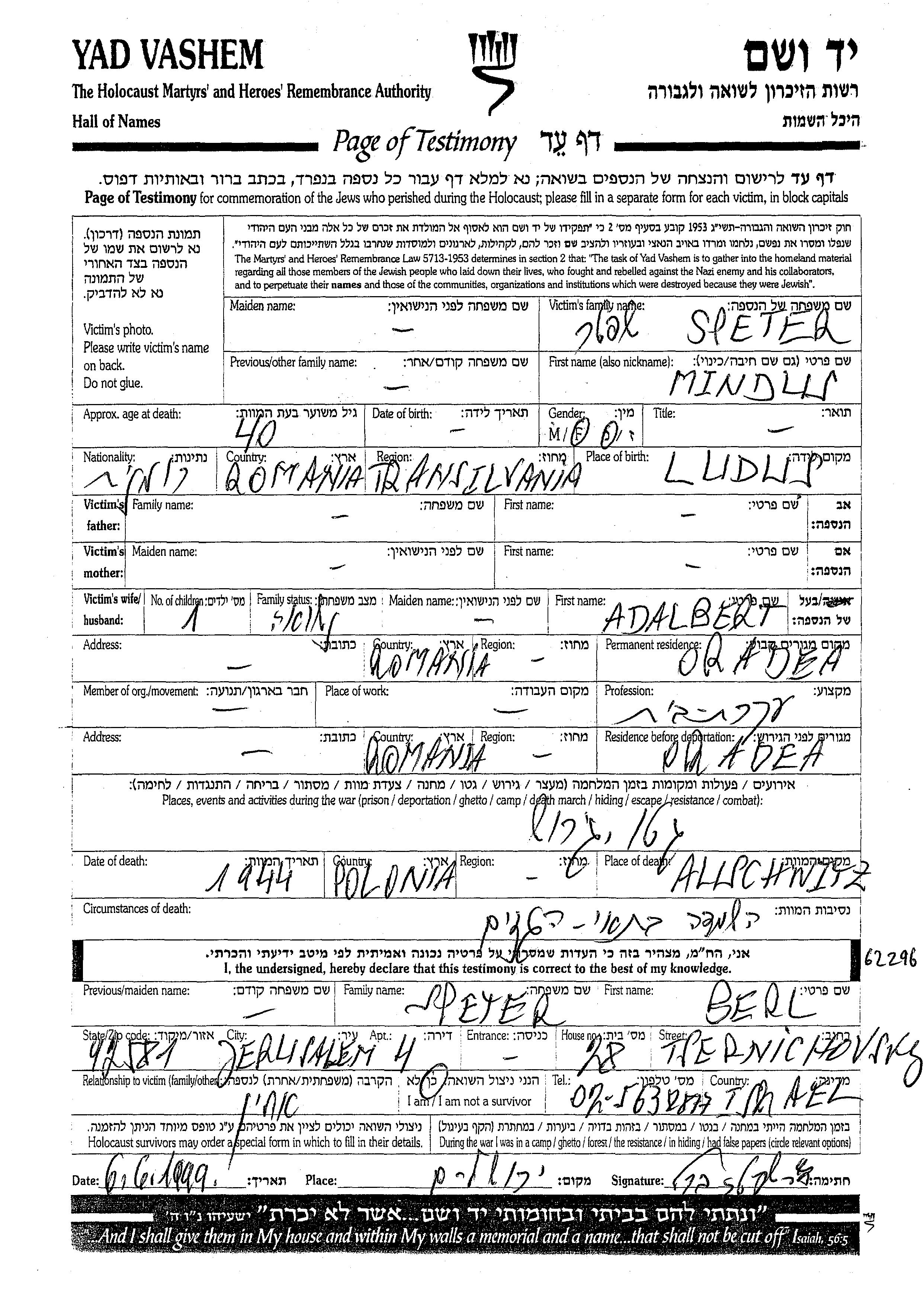 Mindus Speter est née à Ludus, Roumanie. Elle était Femme au foyer et Mariée à Adalbert. Avant la seconde guerre mondiale elle vivait à Oradea, Roumanie. Pendant la guerre, elle était à Oradea, Roumanie.