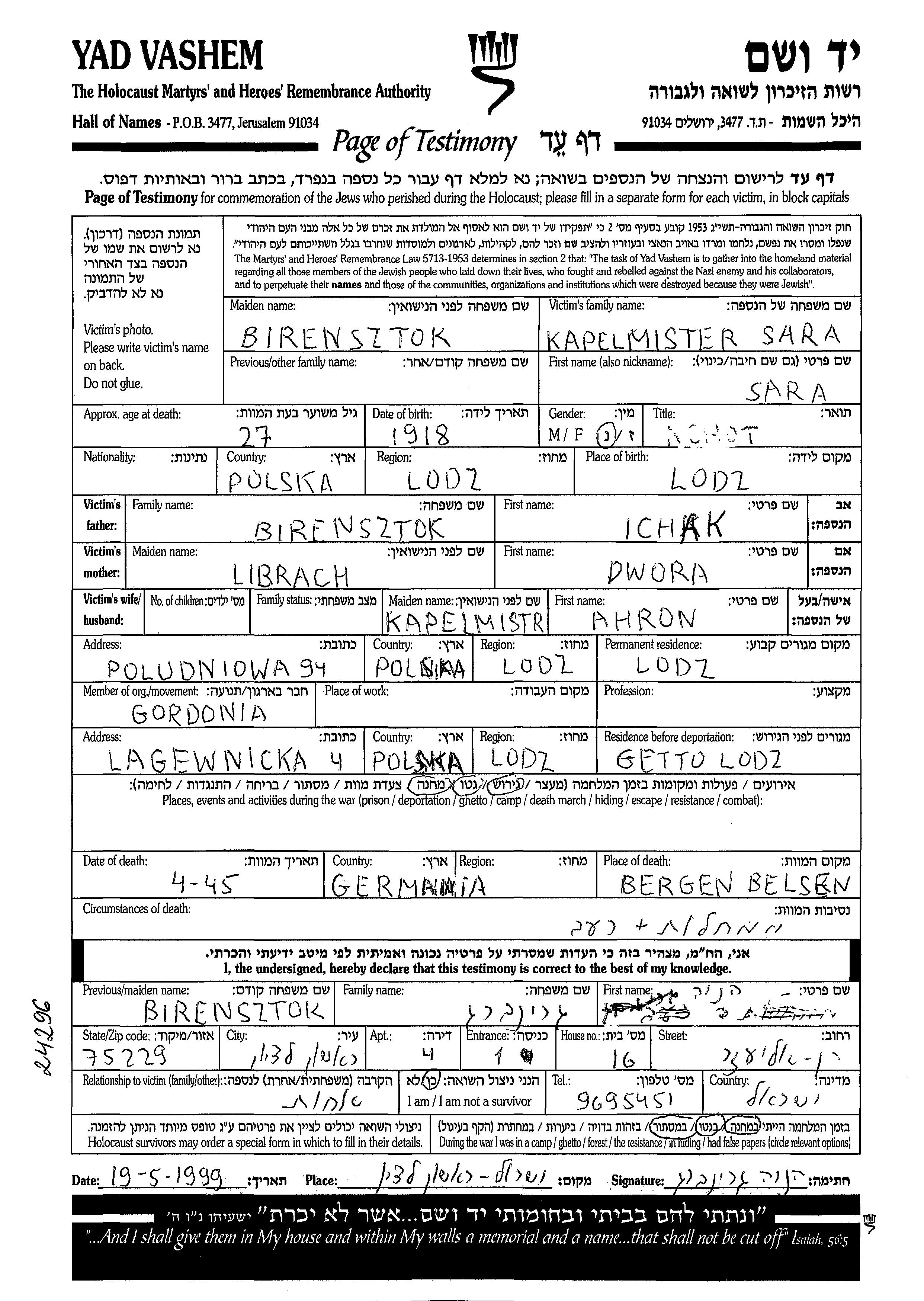 Sara Kapelmister née Birensztok est née à Lodz, Pologne en 1918, fille de Ichak et de Dwora. Elle était Mariée à Ahron. Avant la seconde guerre mondiale elle vivait à Lodz, Pologne. Pendant la guerre, elle était à Lodz, Pologne.