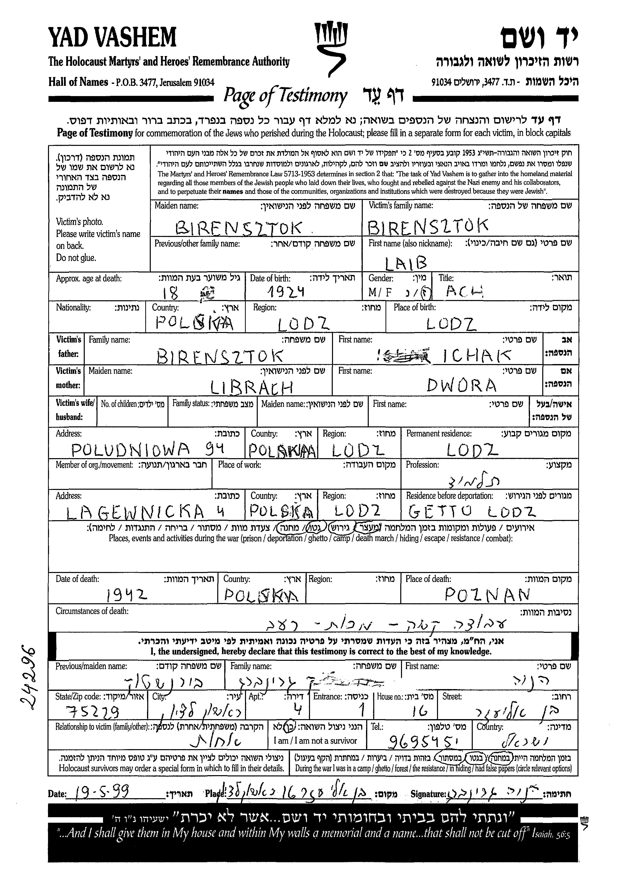 Birensztok Laib 1924 Lodz, Pologne Feuille de témoignage