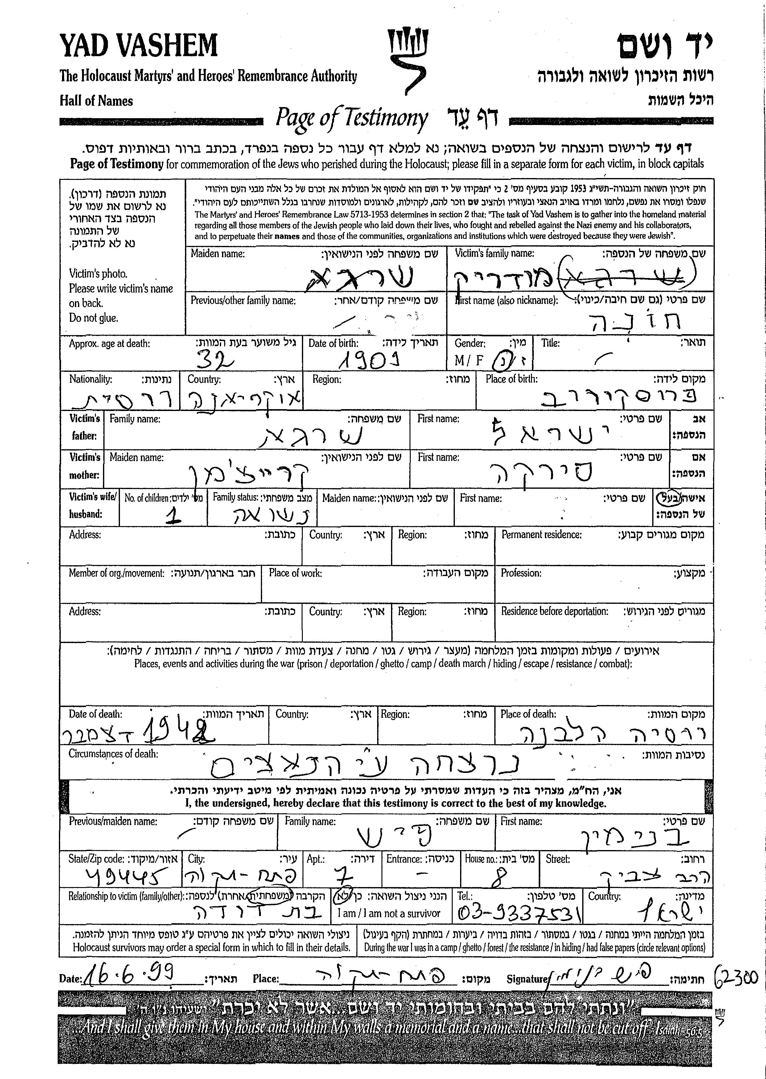 Recherche par date de la mort pendant la période de la Shoah: 1933-1945. Sélectionnez 'Exact'; dans la liste pour rechercher l'année exacte, ou sélectionner '+/- 2 ans'; ou '+/- 5 ans