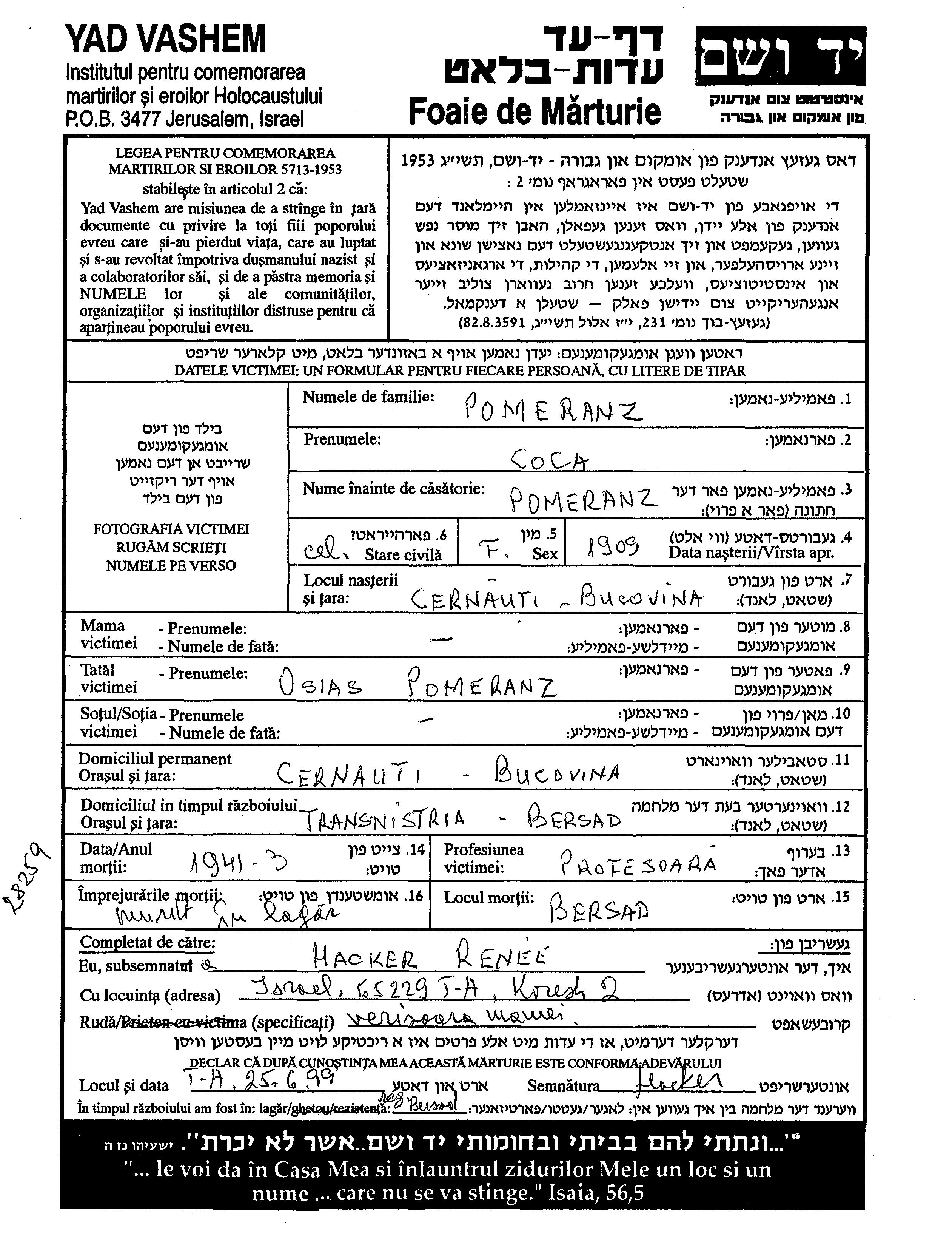 Coca Pomeranz est née à Cernauti, Roumanie en 1909, fille de Osias. Elle était Profesoara de liceu et Célibataire. Avant la seconde guerre mondiale elle vivait à Cernauti, Roumanie.
