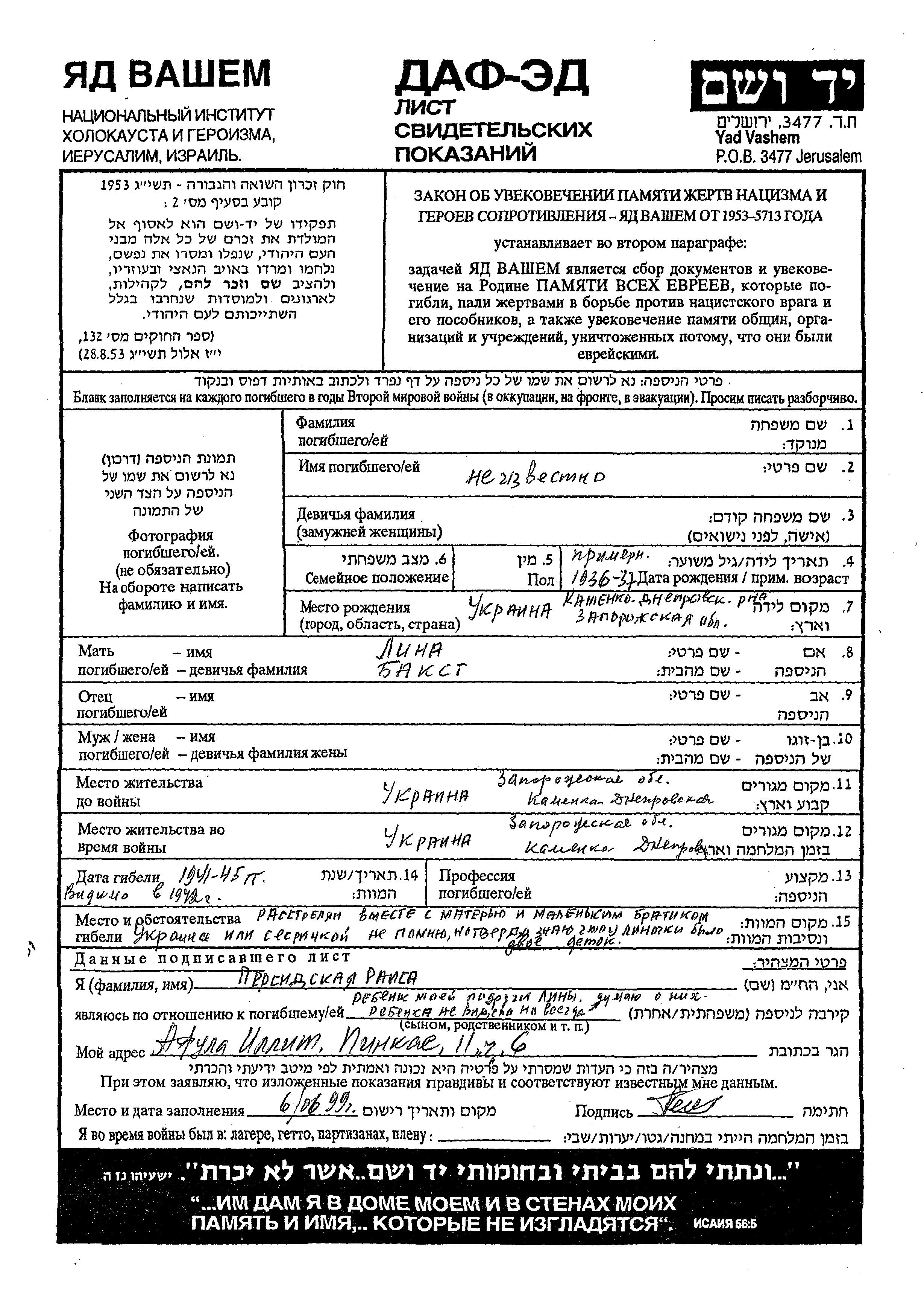 Yad Vashem - Pages of Testimony Names Memorial Collection