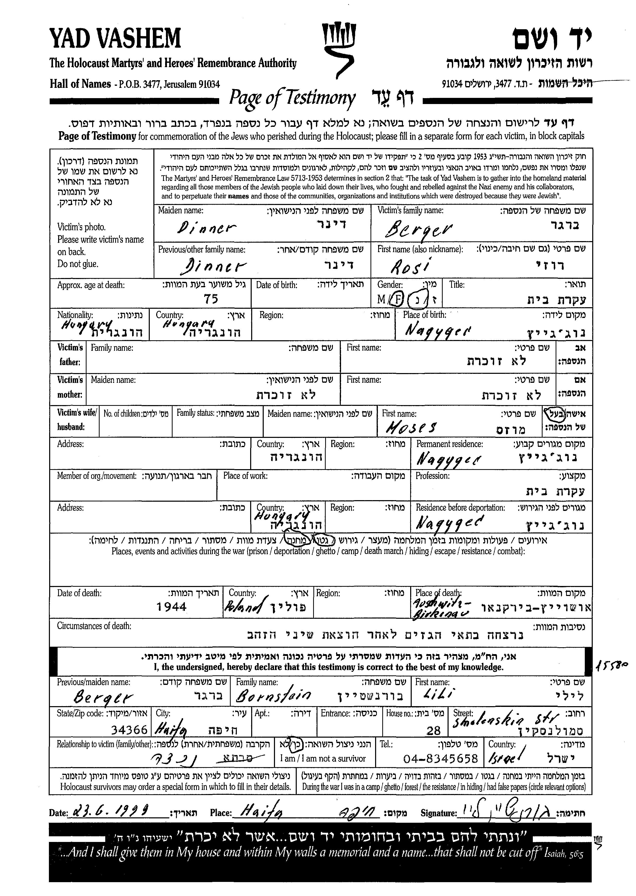 Berger Rosi Nagygec, Hongrie Feuille de témoignage
