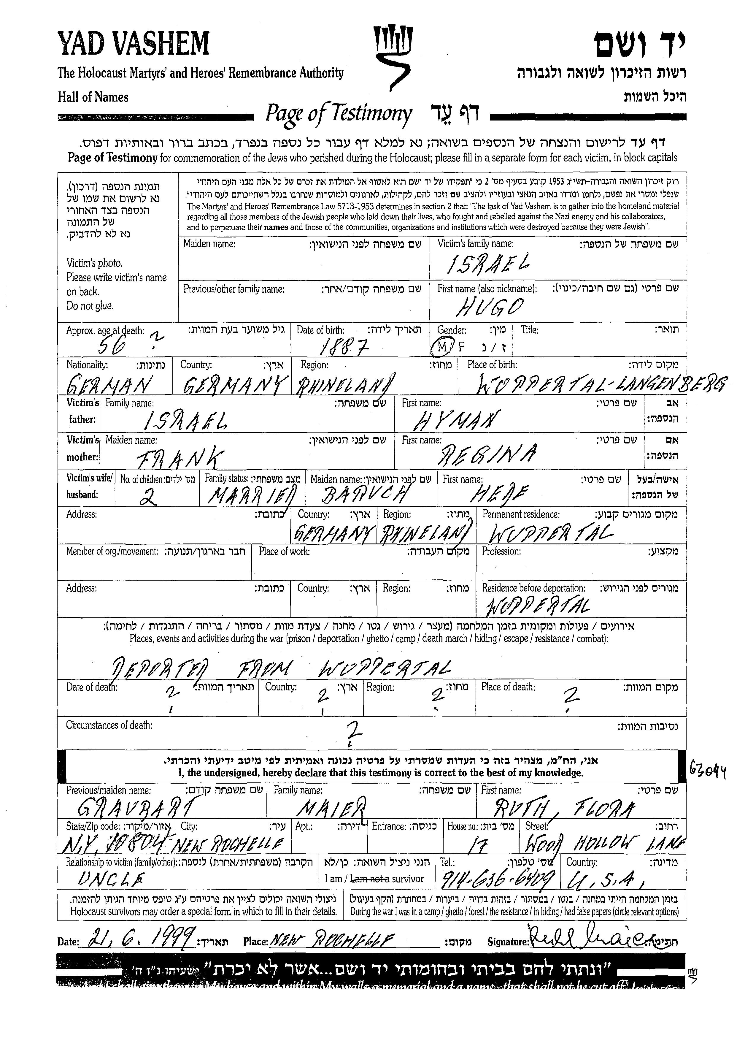 Hugo Israel est né à Wuppertal, Allemagne en 1887, fils de Hyman et de Regina. Il était Mariée à Hede née Baruch. Avant la seconde guerre mondiale il vivait à Wuppertal, Allemagne. Au cours de la guerre, il était à Wuppertal, Allemagne.