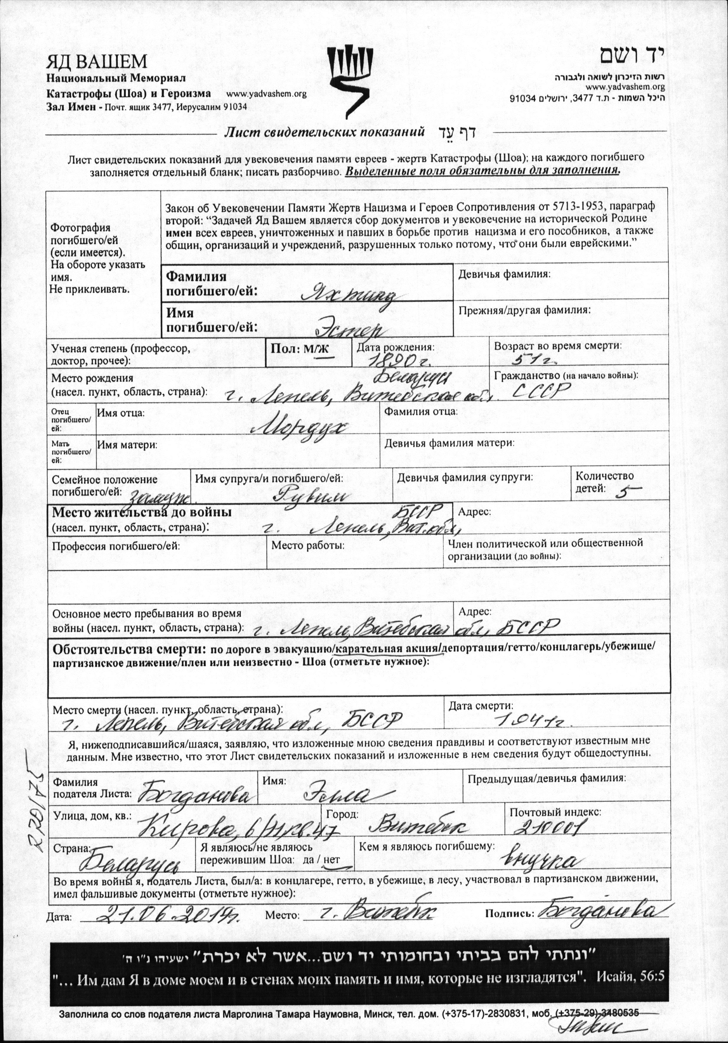 Yakhtind Ester 1890 Lepel, Bélorussie (URSS) Feuille de témoignage