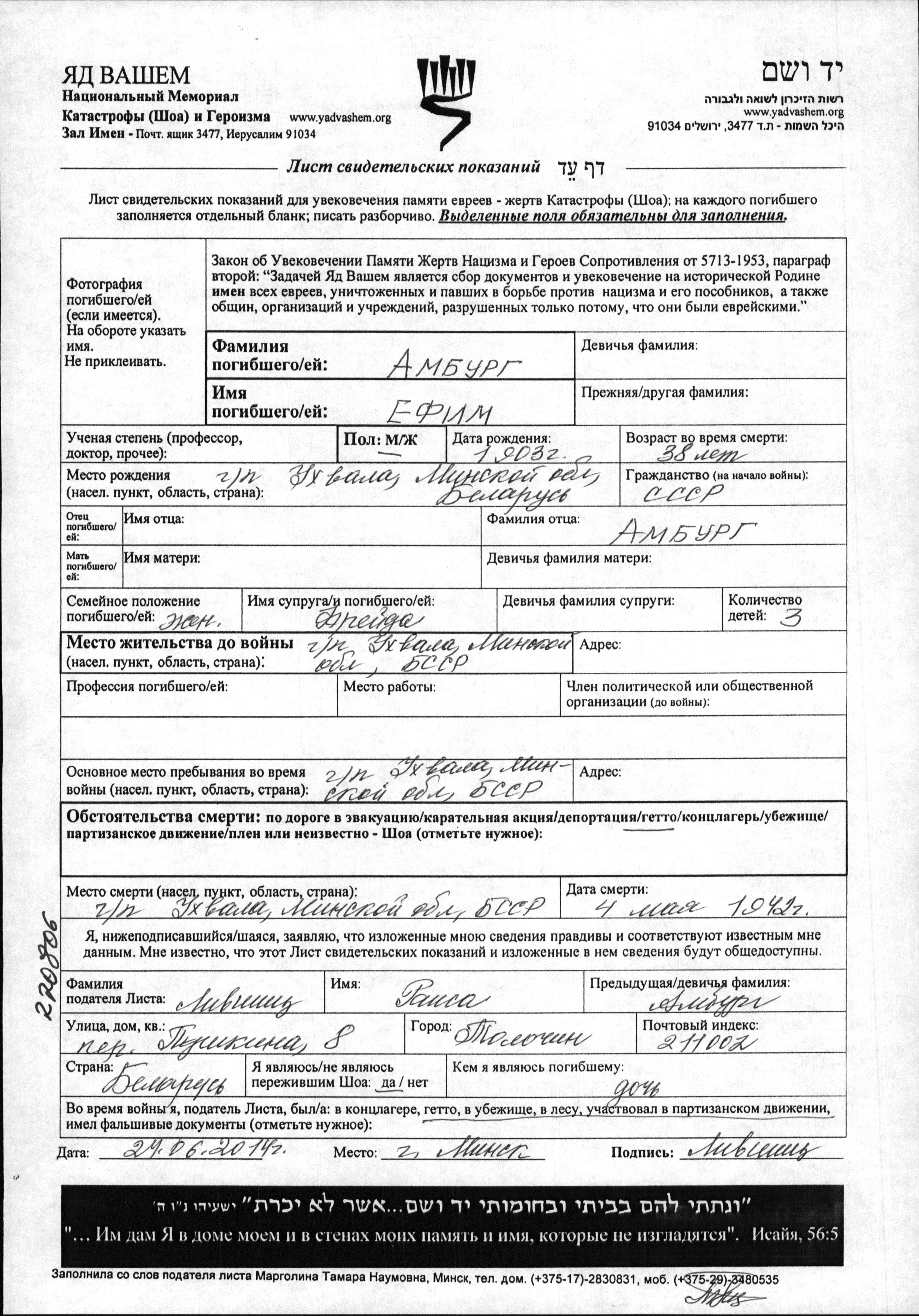 Yefim Amburg est né à Ukhvala, Bélorussie (URSS). Il était Mariée à Freyda. Avant la seconde guerre mondiale il vivait à Ukhvala, Bélorussie (URSS). Au cours de la guerre, il était à Ukhvala, Bélorussie (URSS).