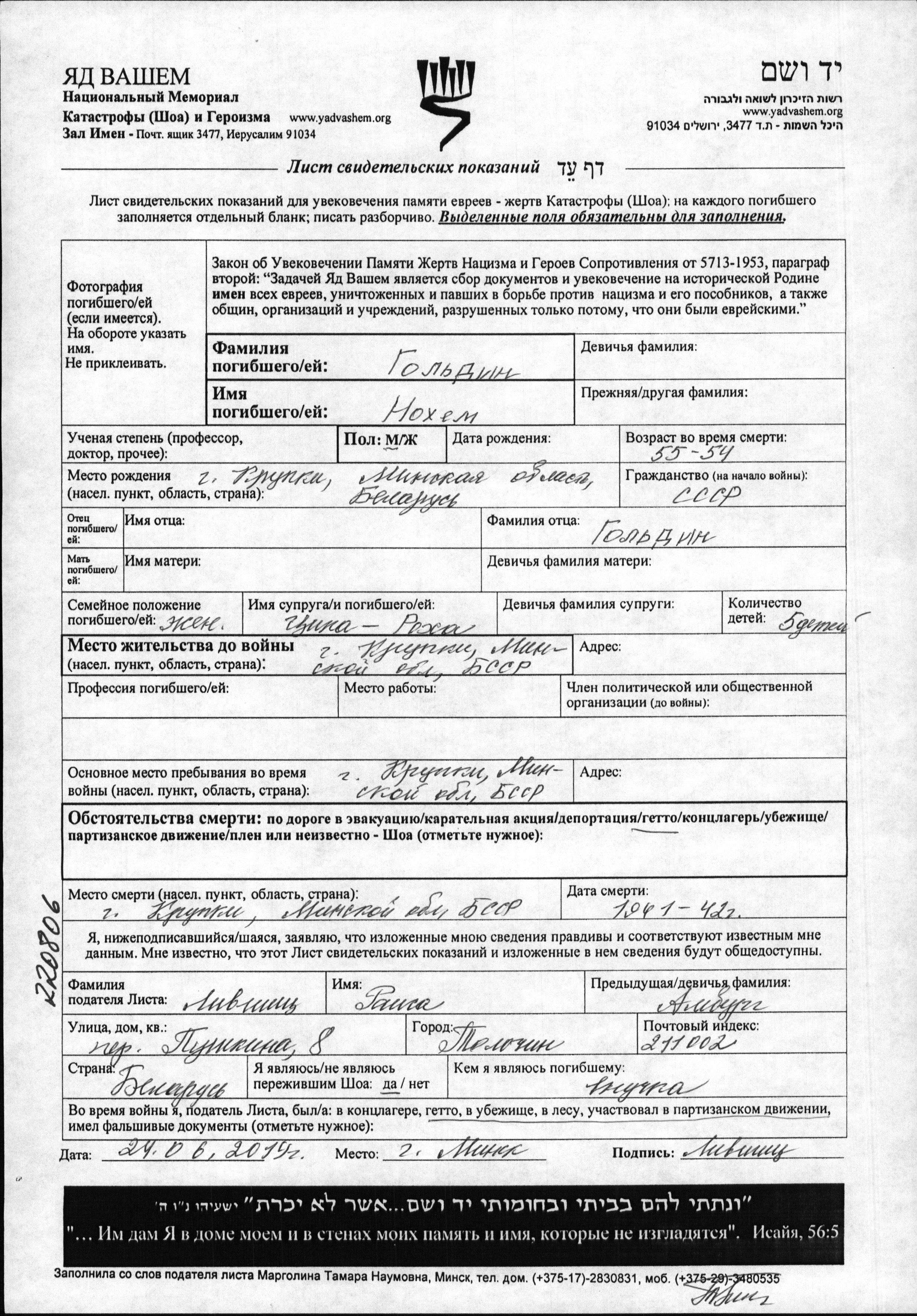 Nokhem Goldin est né à Krupki, Bélorussie (URSS). Il était Mariée à Tzila Rukha. Avant la seconde guerre mondiale il vivait à Krupki, Bélorussie (URSS). Au cours de la guerre, il était à Krupki, Bélorussie (URSS).
