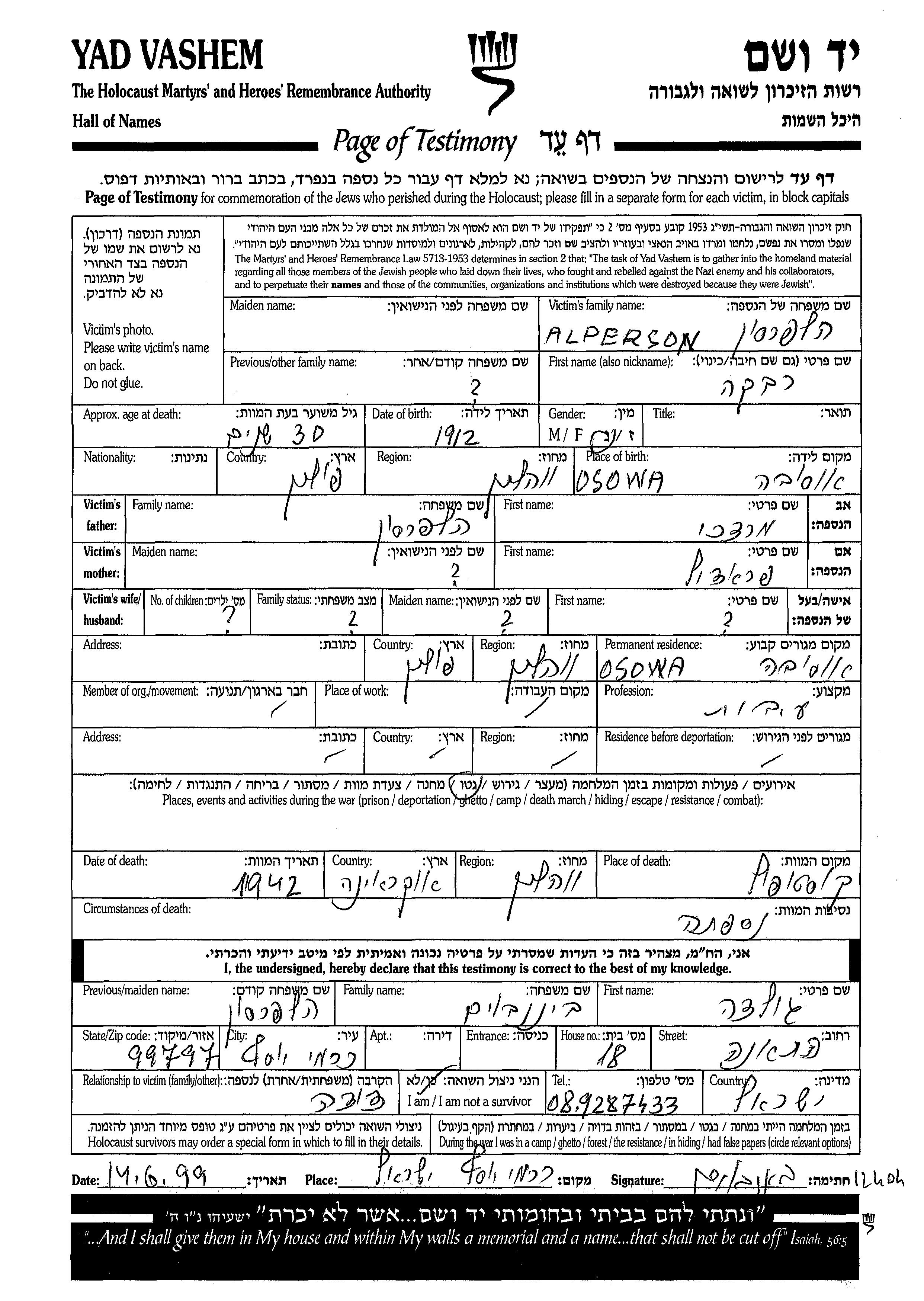 Alperson Rivka 1912 Osowa Wyszka, Pologne Feuille de témoignage