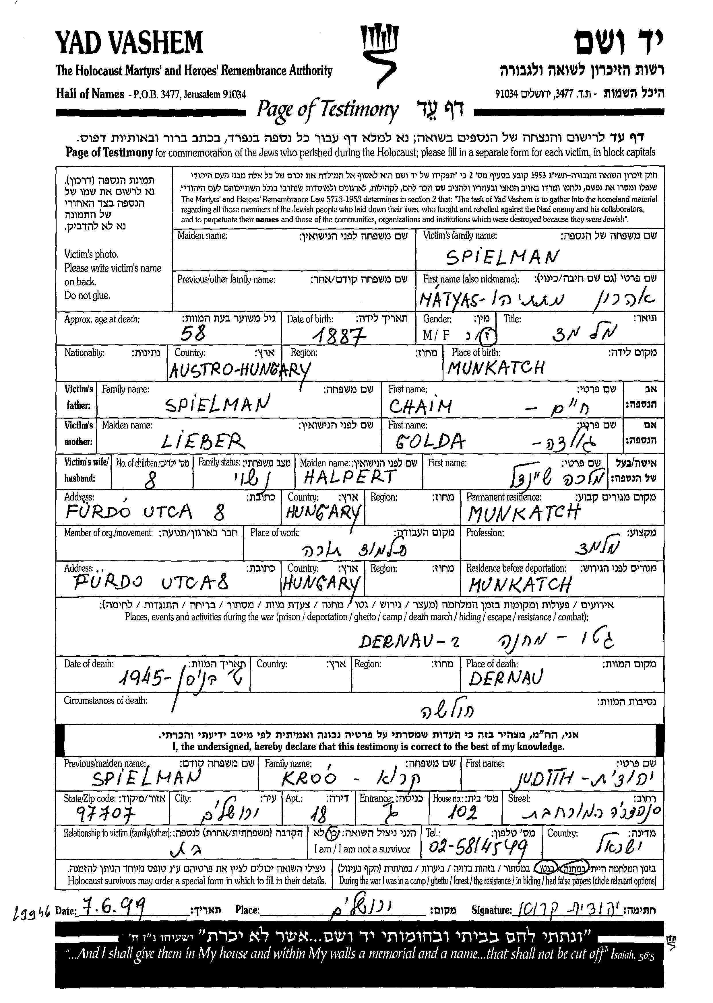 Spielman Matyas Aharon 1887 Munkac, Tchécoslovaquie Feuille de témoignage