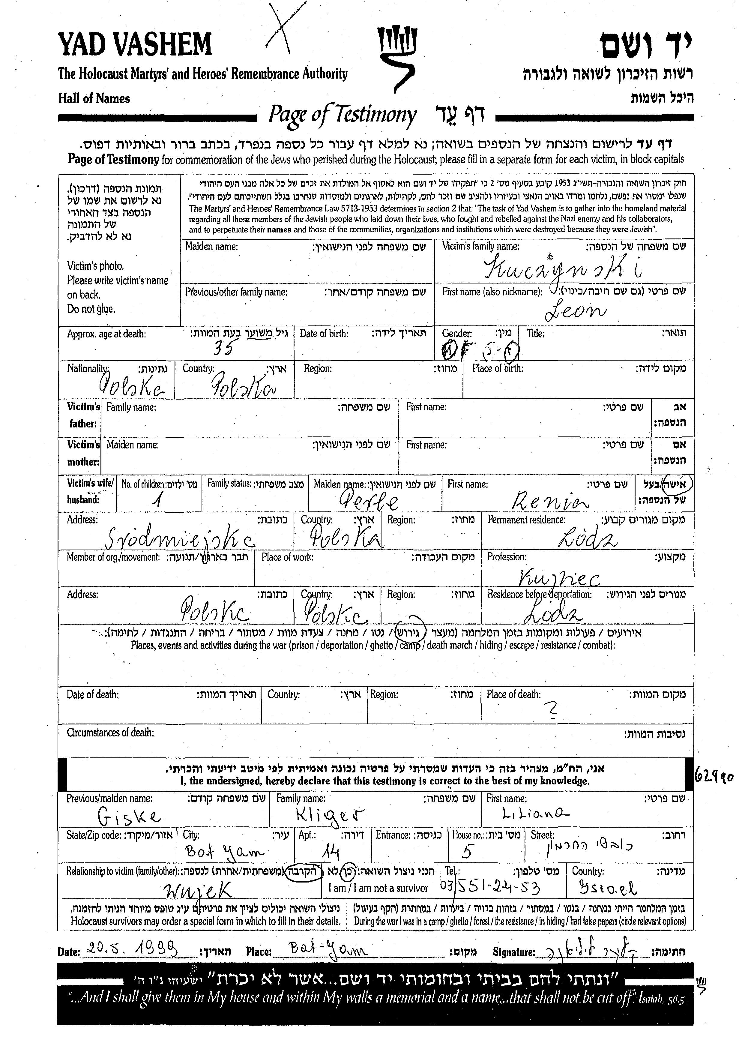 Kuczynski Leon Lodz, Pologne Feuille de témoignage