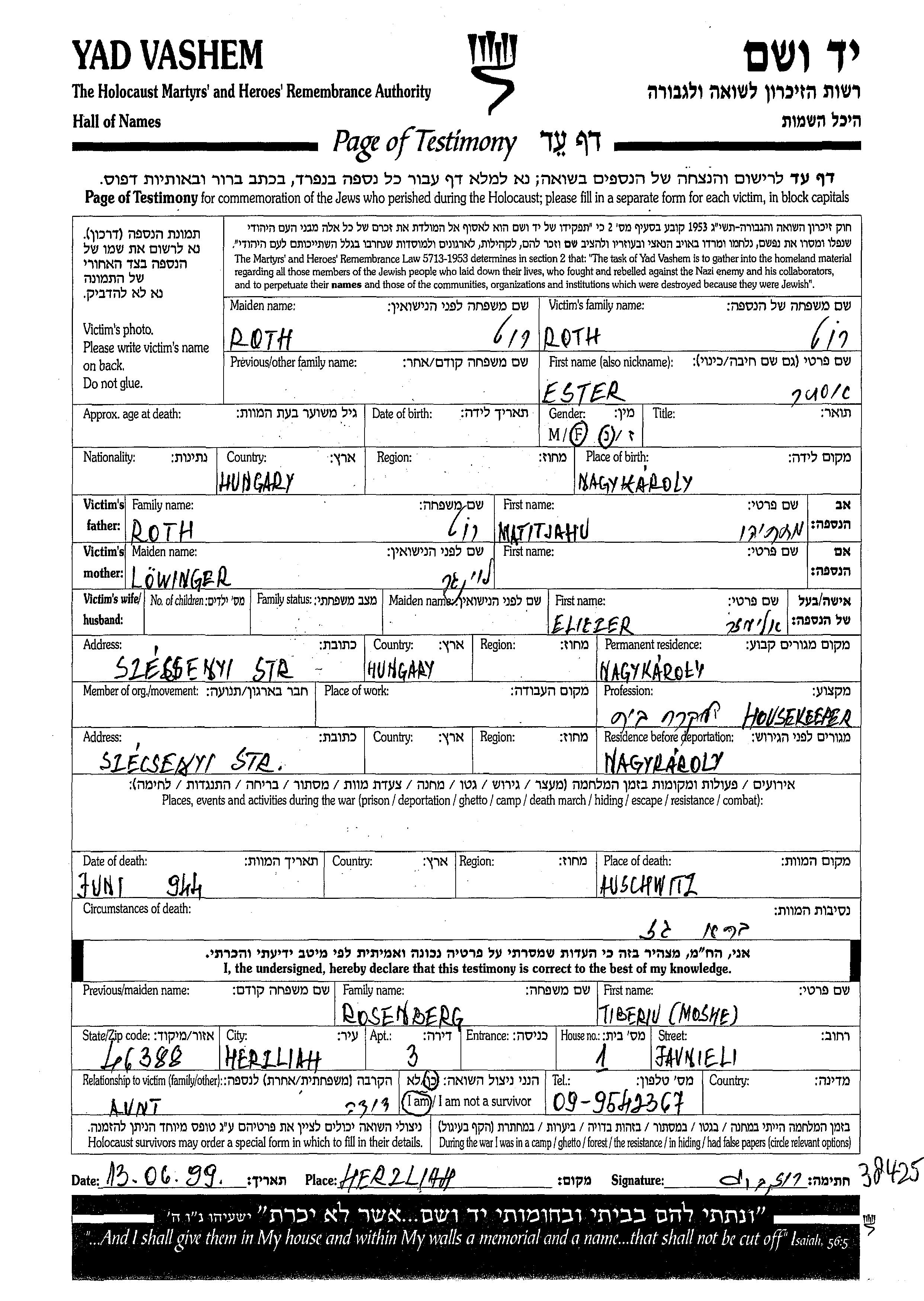 Roth Rut Ester Nagykaroly, Roumanie Feuille de témoignage