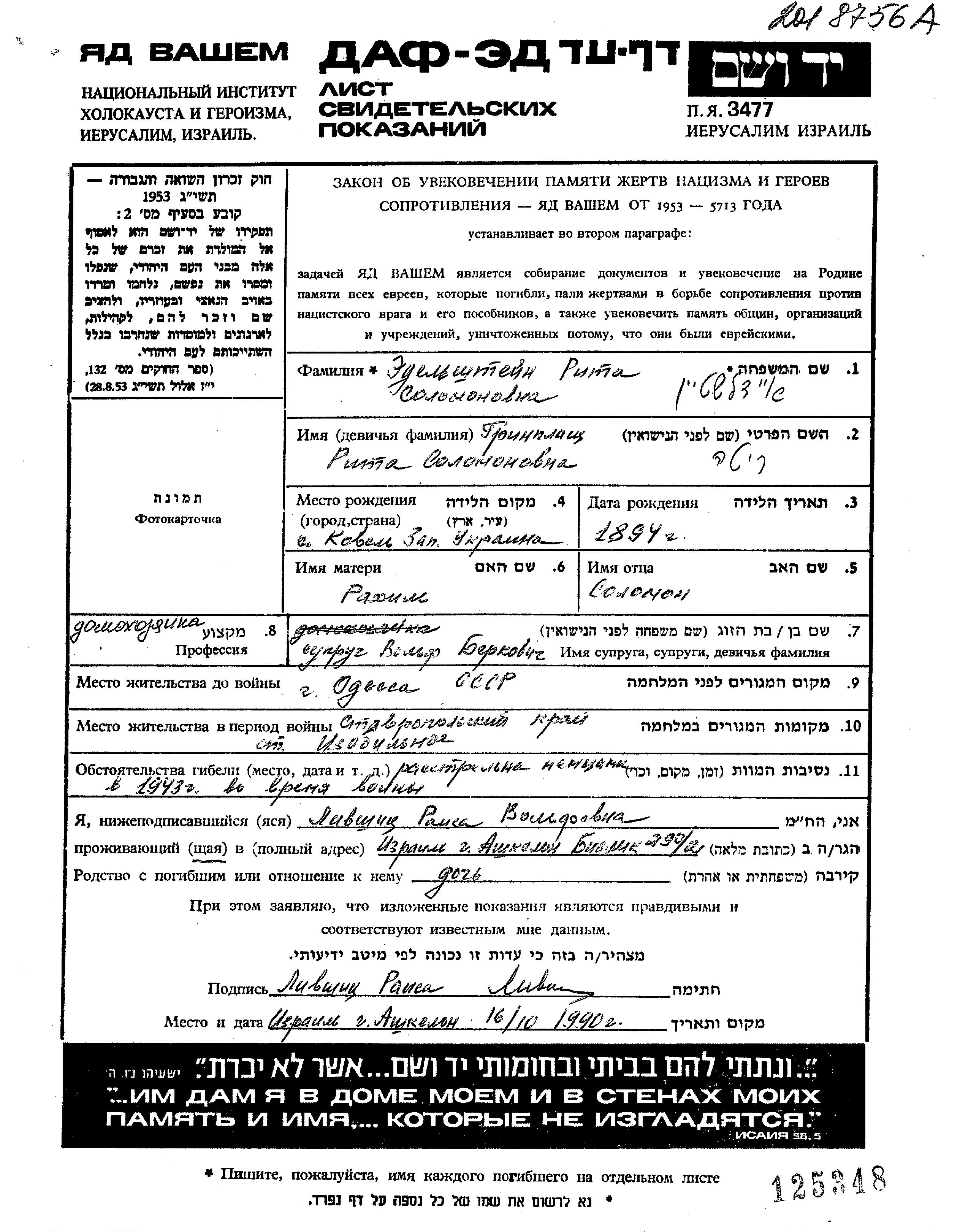 Edelshtein Rita 1894 Odessa, Ukraine (URSS) Feuille de témoignage