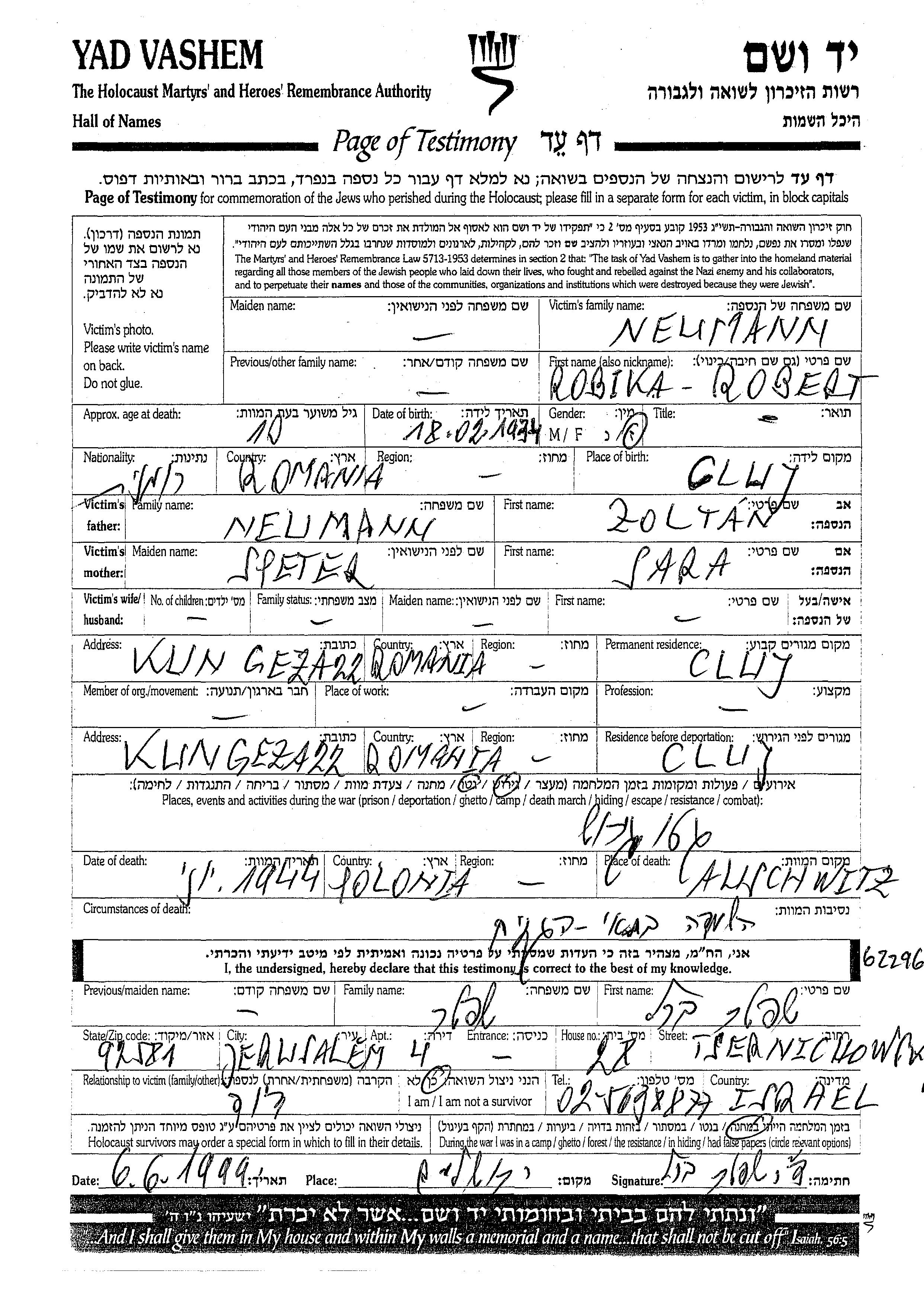 Yad Vashem - Pages of Testimony Names Memorial Collection