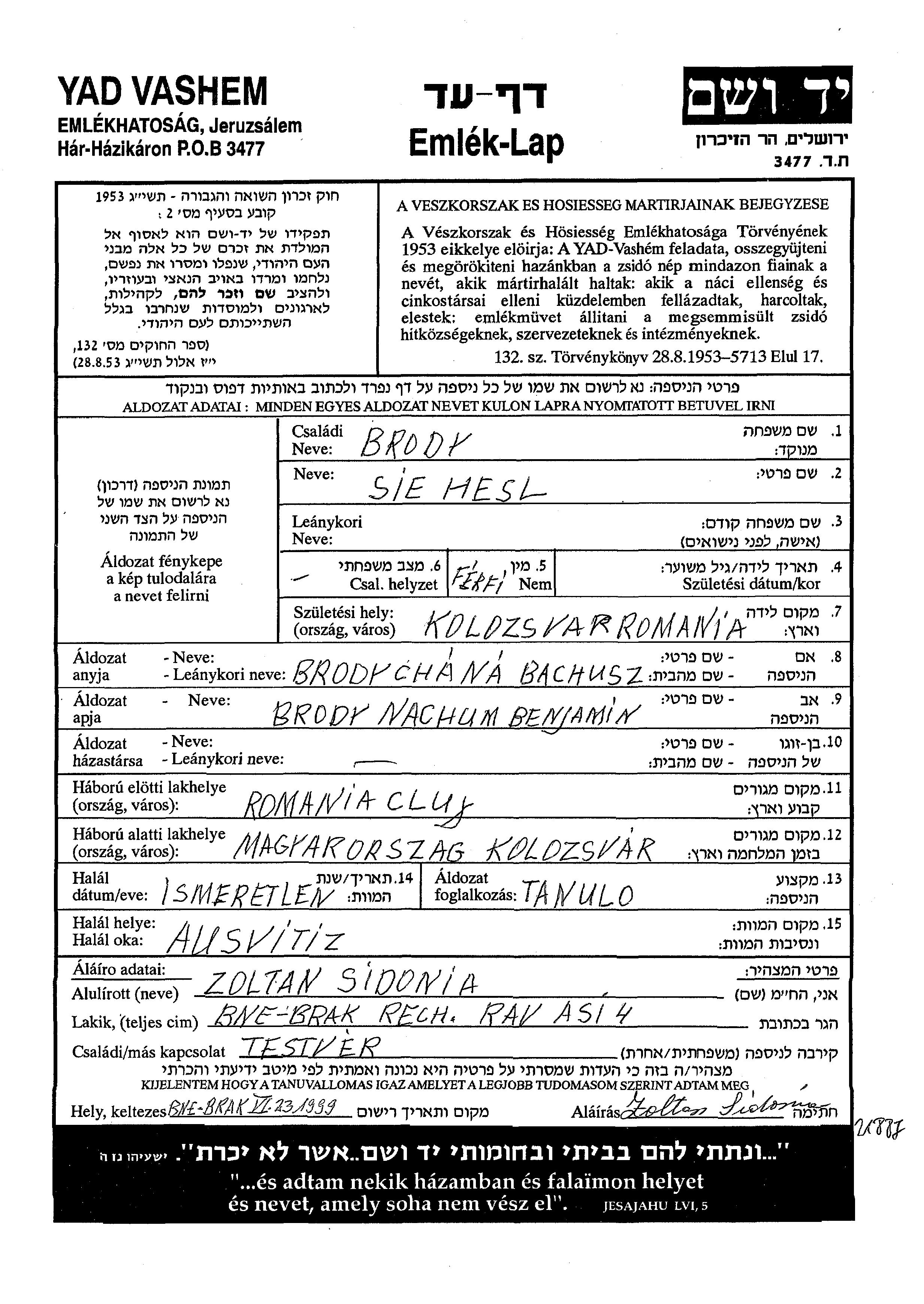 Sie Hesl Brody est né à Kolozsvar, Roumanie, fils de Nachum Benjamin et de Chana. Il était Élève. Avant la seconde guerre mondiale il vivait à Cluj, Roumanie. Au cours de la guerre, il était à Kolozsvar, Roumanie.