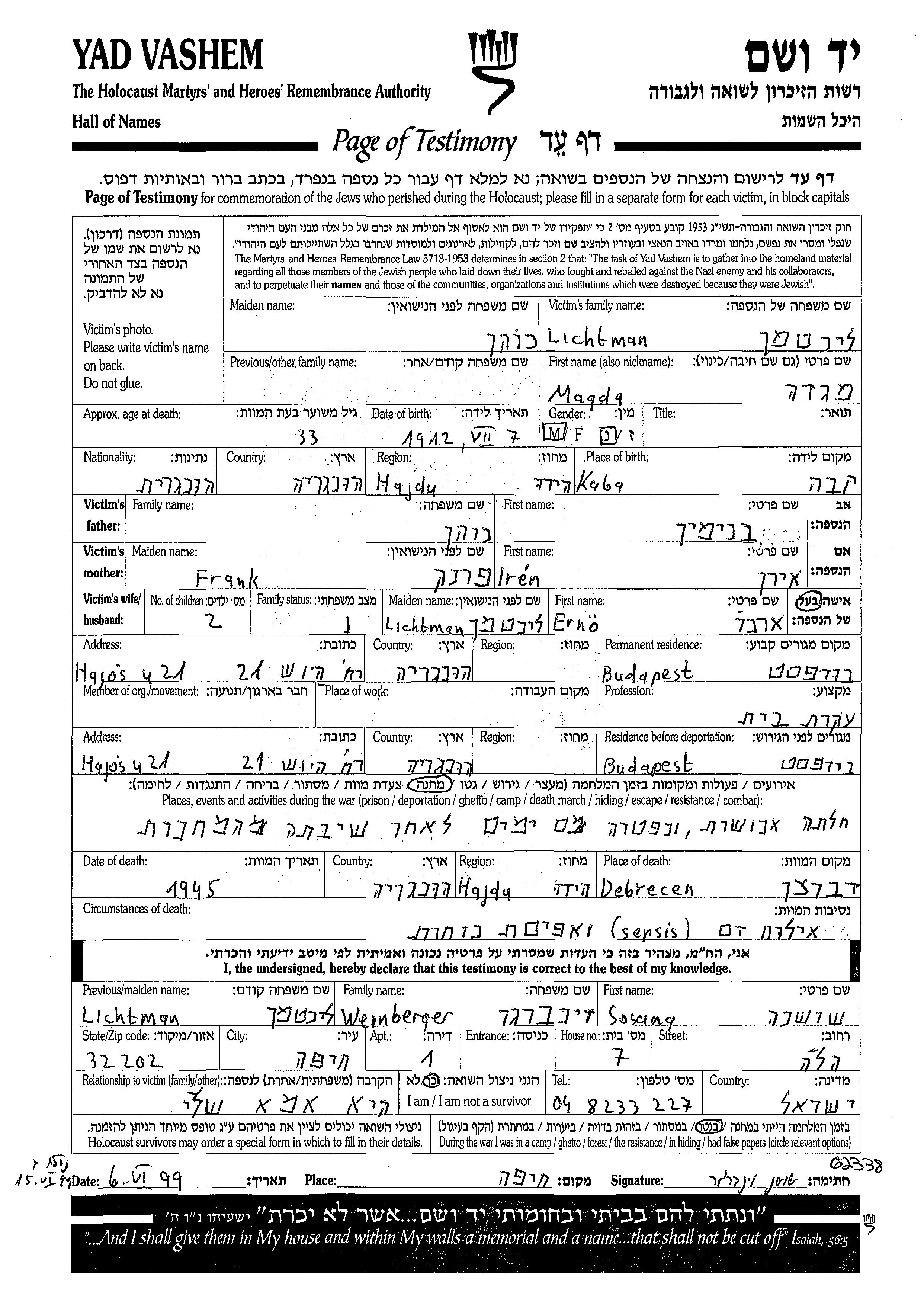 Lichtman Magda 1912 Budapest, Hongrie Feuille de témoignage