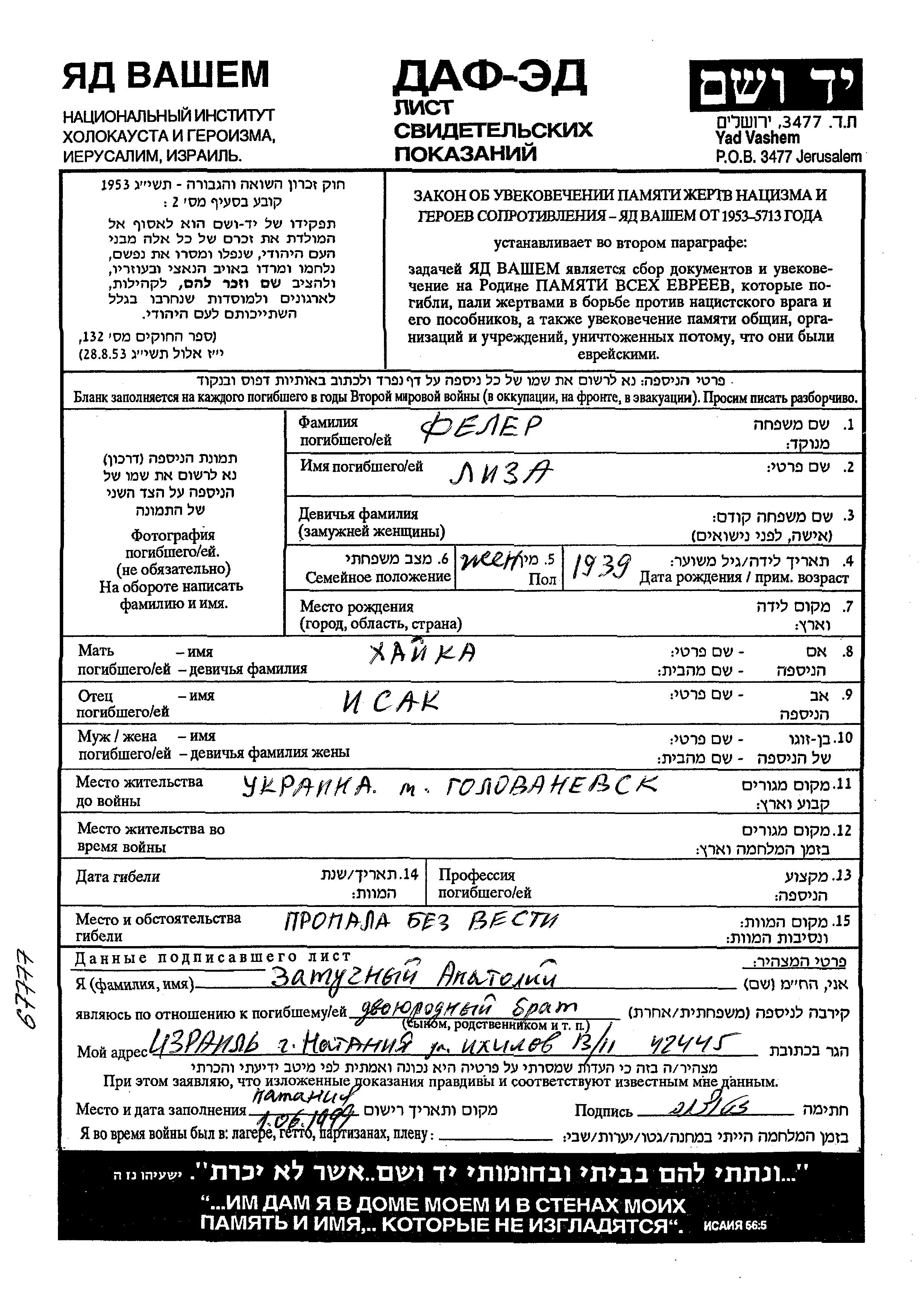 Feler Liza 1939 Golovanevsk, Ukraine (URSS) Feuille de témoignage