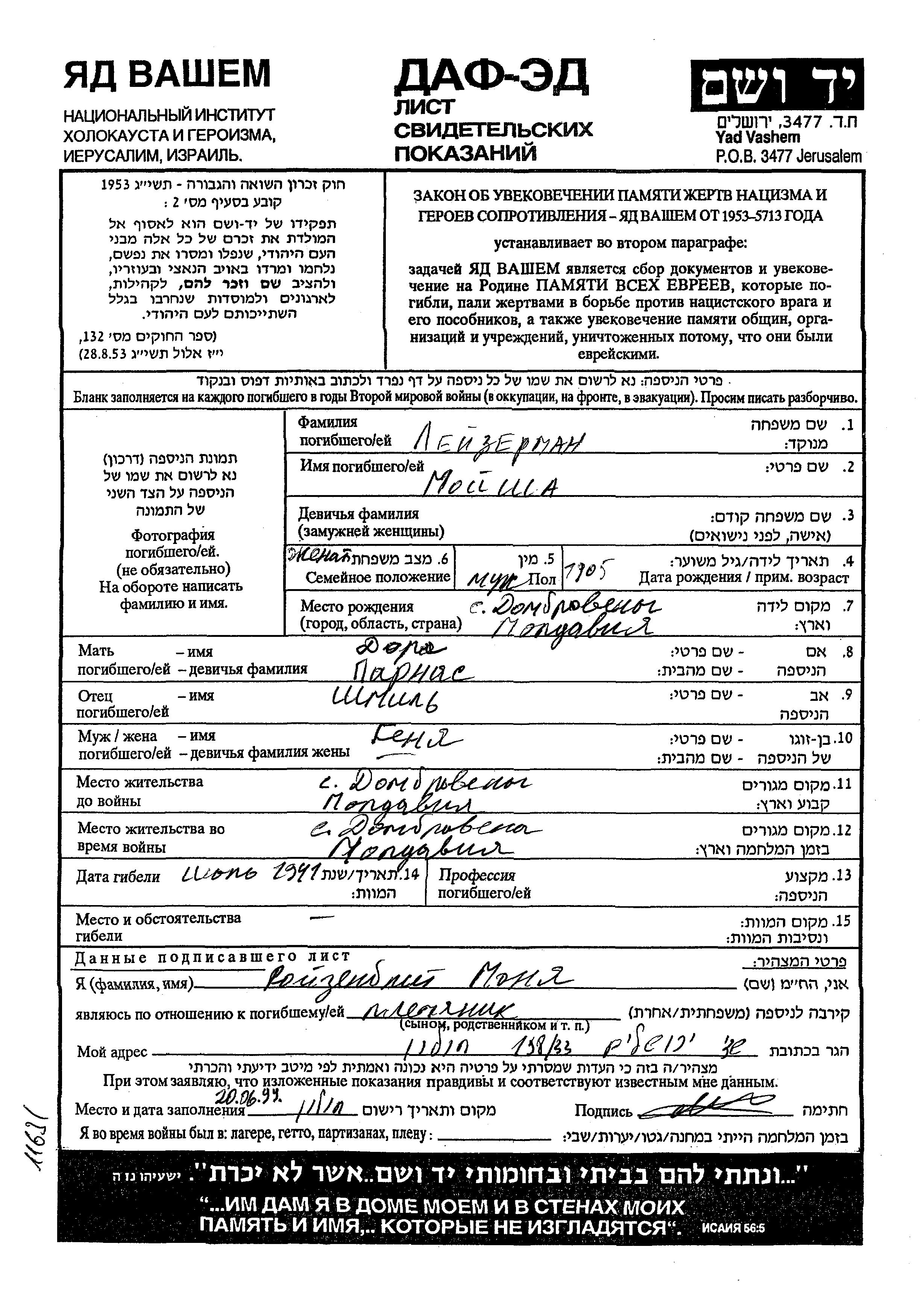 Yad Vashem - Pages of Testimony Names Memorial Collection