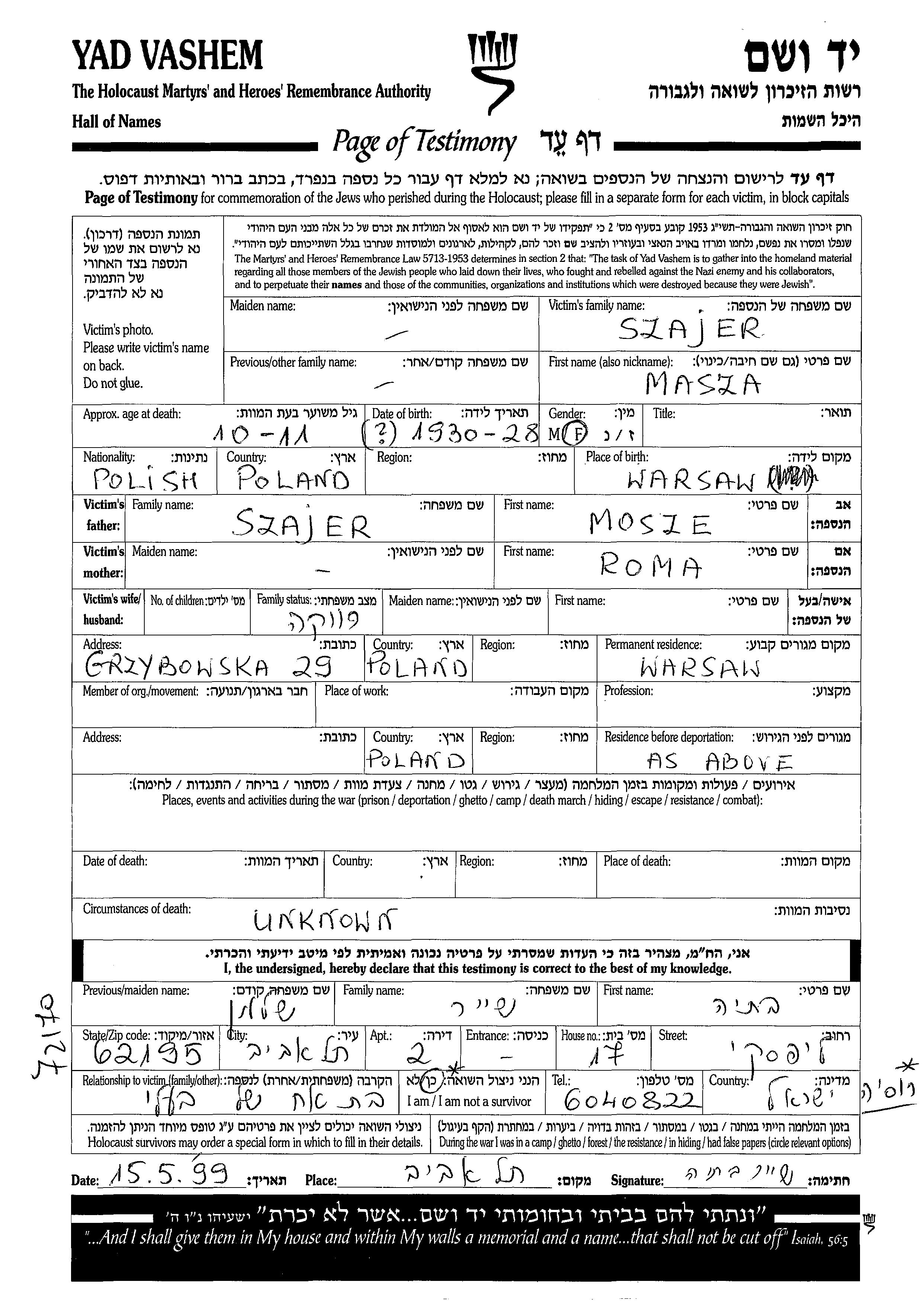 Szajer Masza 1930 Warszawa, Pologne Feuille de témoignage