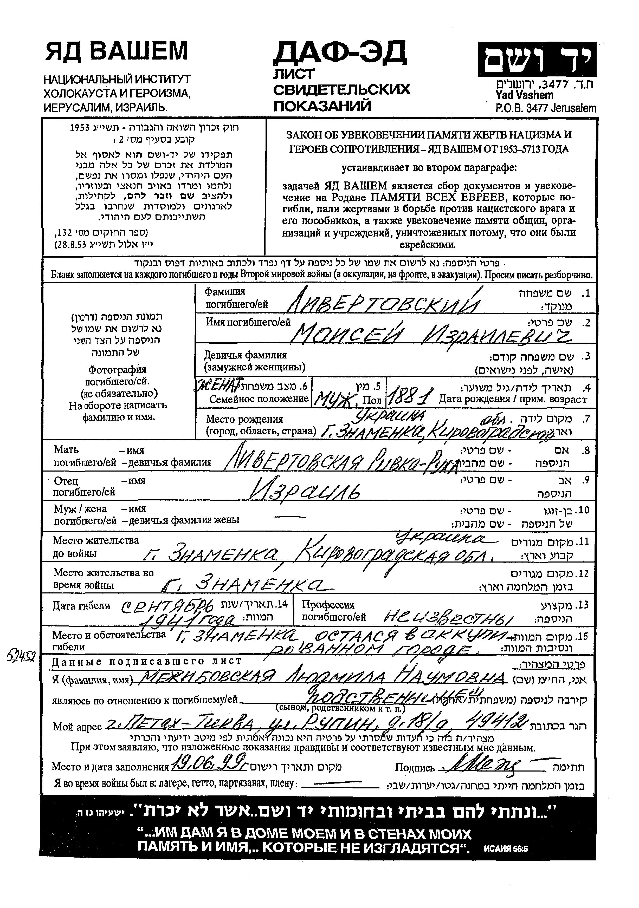 Moisey a été assassiné pendant la Shoah. Lieu de la mort: Znamenka, Ukraine (URSS) en 09/1941.