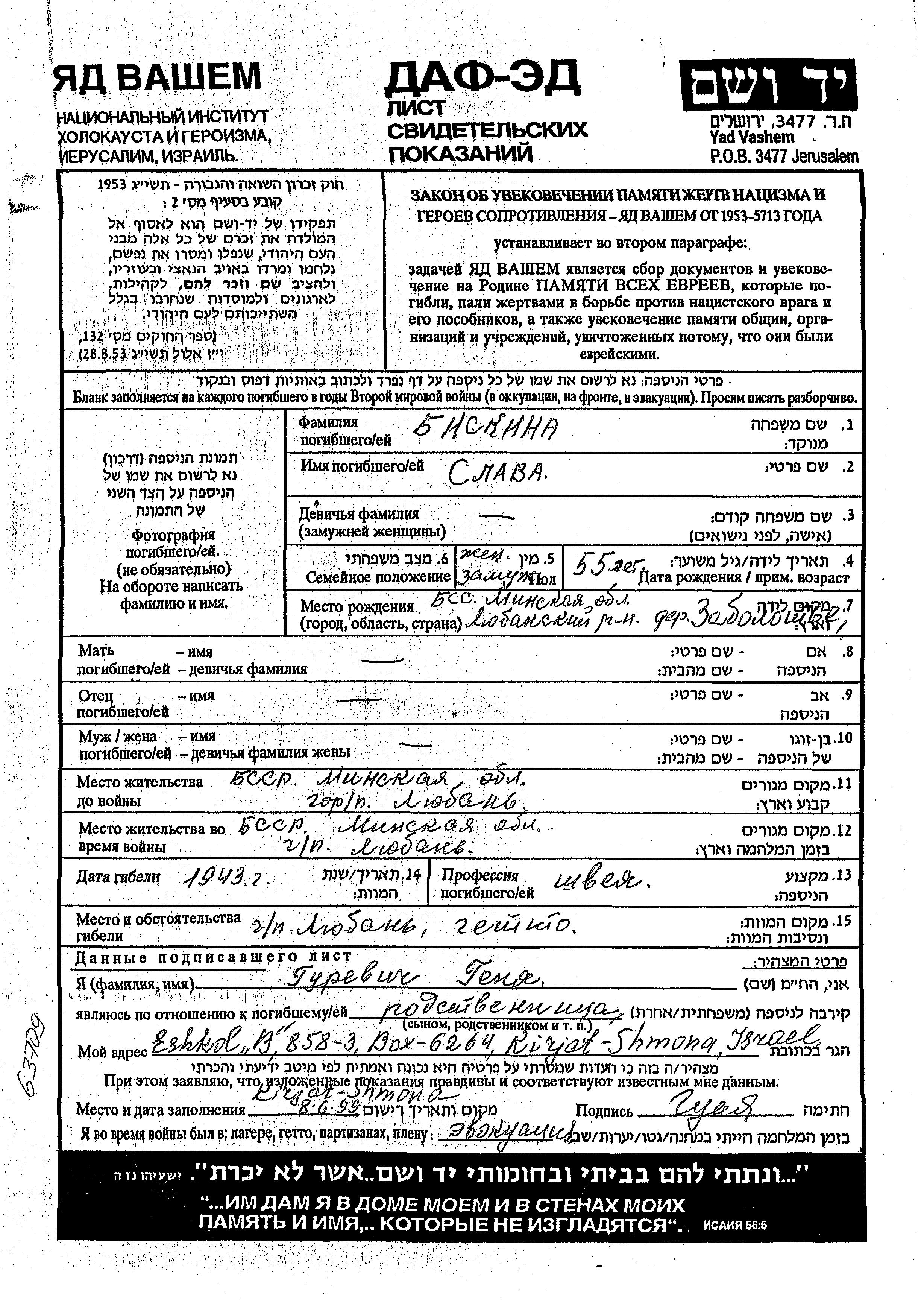 Biskin Slava Lyuban, Bélorussie (URSS) Feuille de témoignage