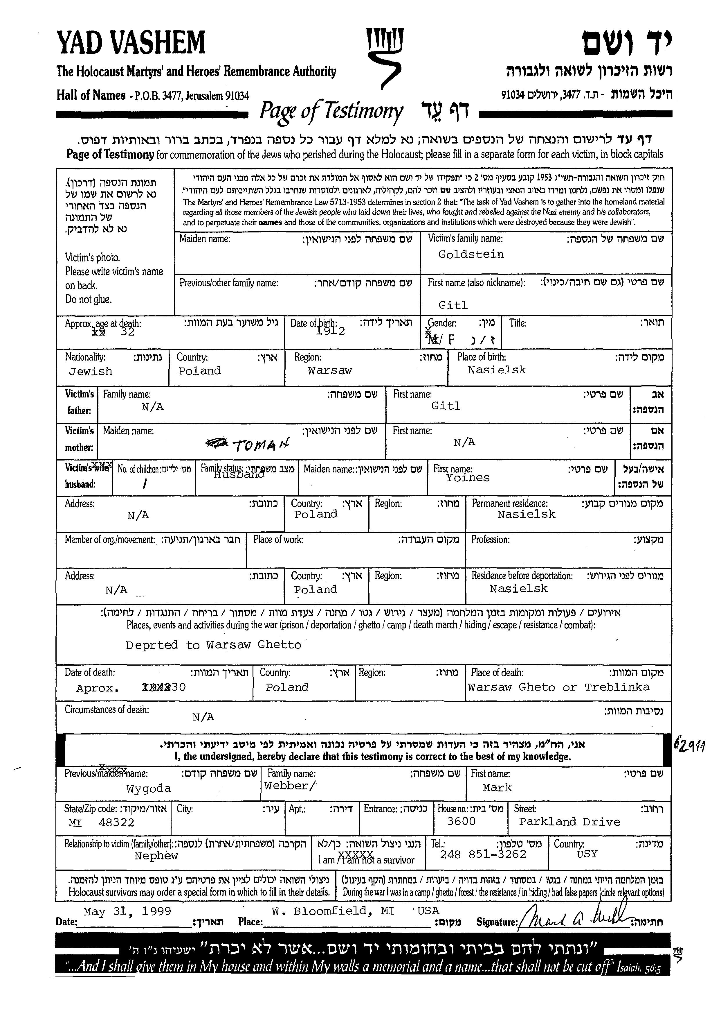 Goldstein Gitl 1912 Nasielsk, Pologne Feuille de témoignage